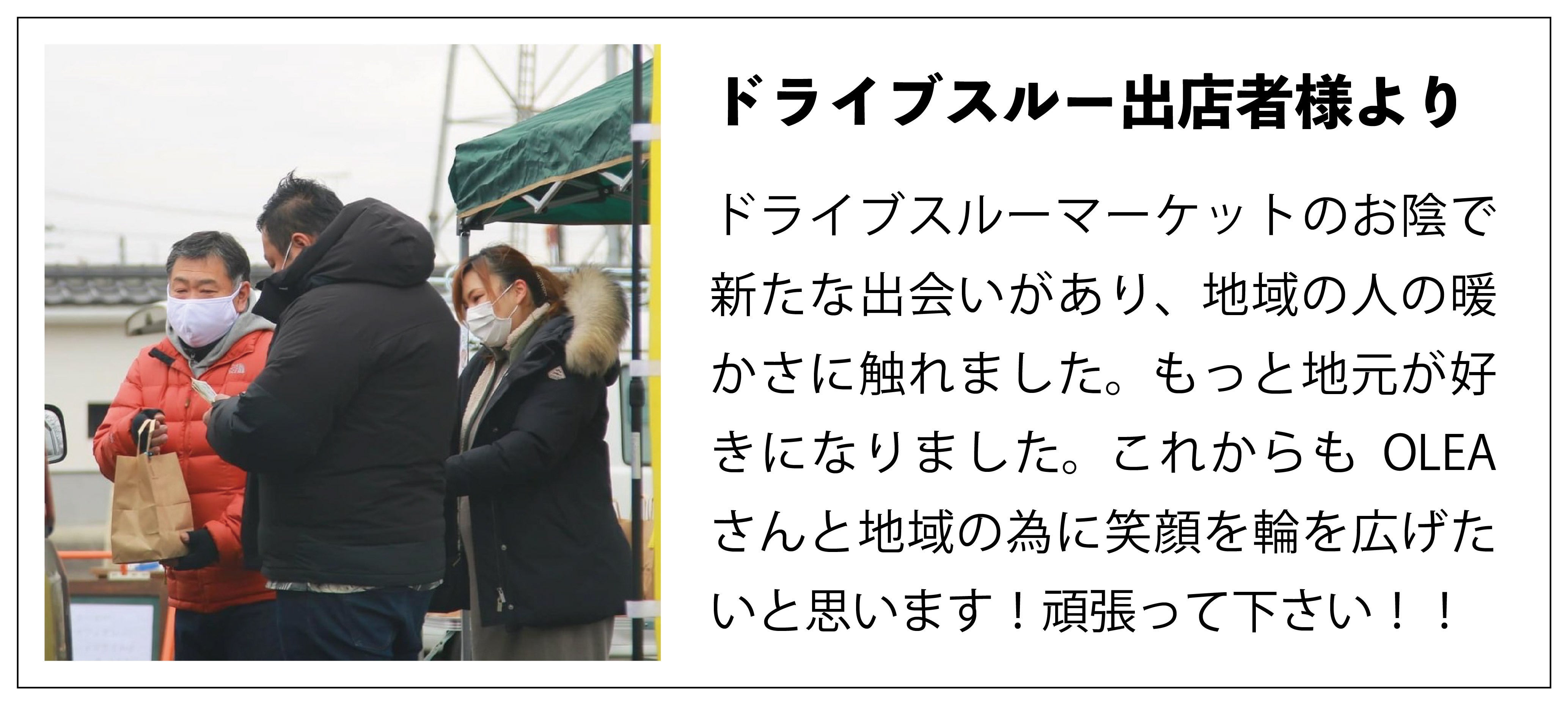 OLEAのお庭にてドライブスルーマーケットを開催。飲食店から八百屋さんまで12を越える店舗の方にお声がけし、緊急事態宣言の間4回にわたって開催しました。