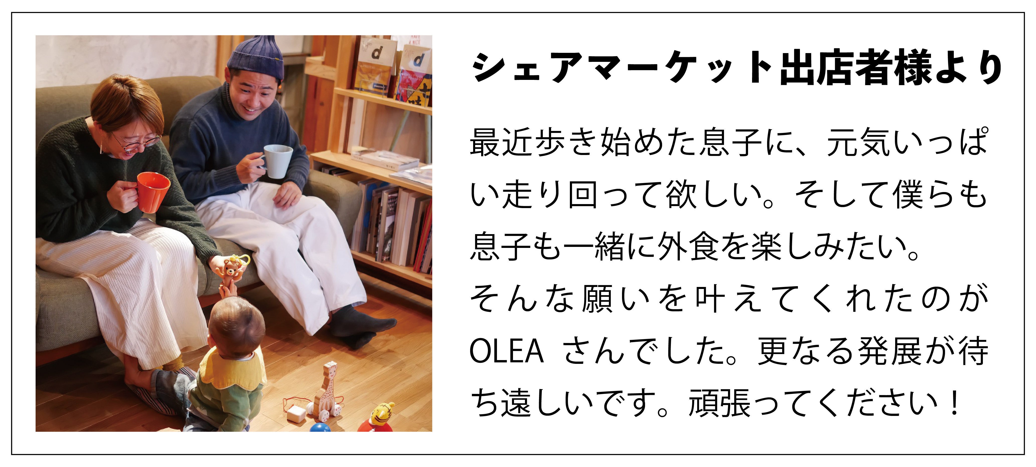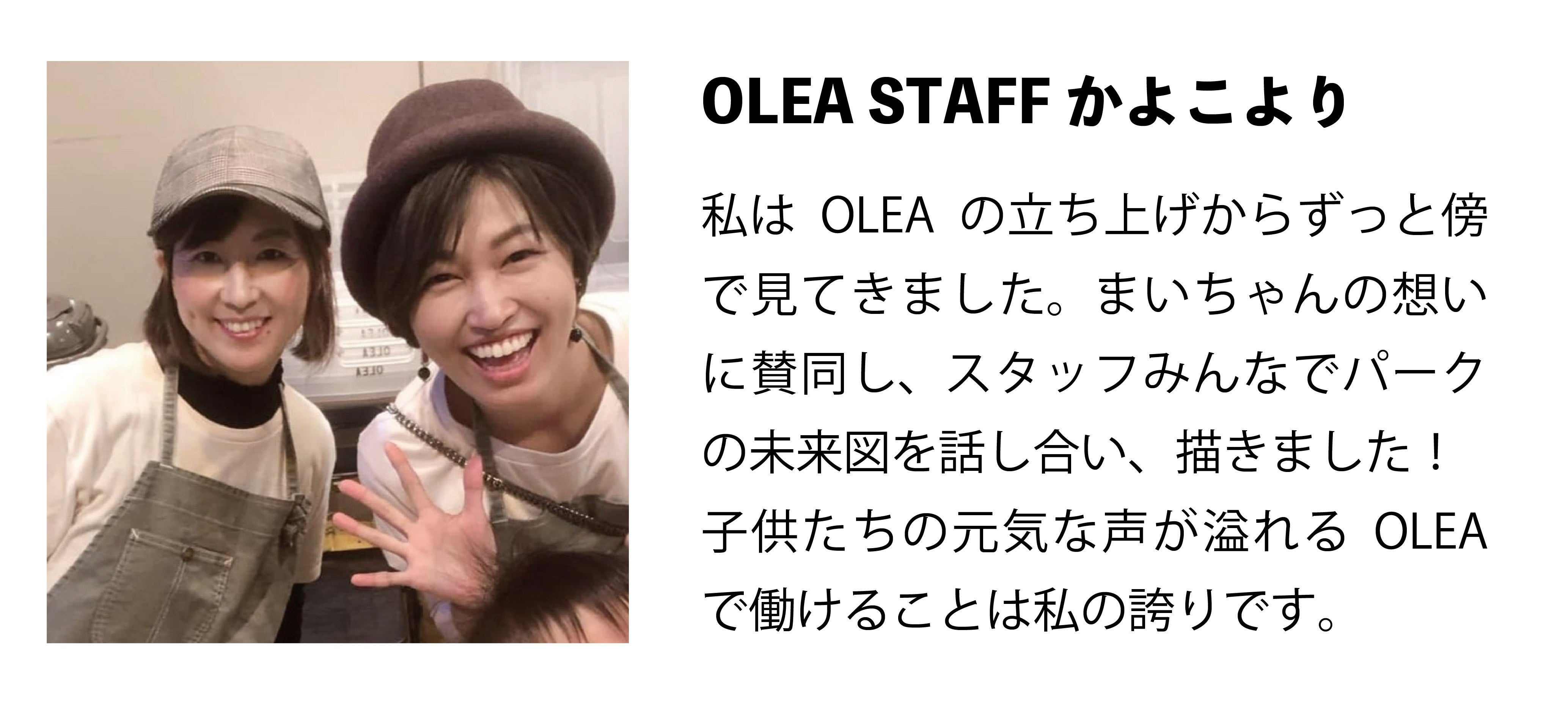 けれど、どんなカタチでもいい。人と人が共に過ごす暖かで豊かな場所。子供から大人まで笑顔溢れる「私たちの平和」をもう一度、みなさんと一緒に築いていきたい。そんな想いで始めたプロジェクト、どうか私たちOLEAの新しい挑戦を暖かく見守っていただければ嬉しいです。