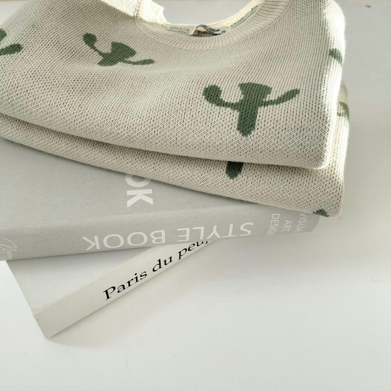 サボテンデザインのオシャレニットですユニセックスでカラーボトムに合わせてカラフルに仕上げてもよしブラックやホワイトでモノトーンと合わせても良しデザイン性がありますが何にでも合うトップスです!