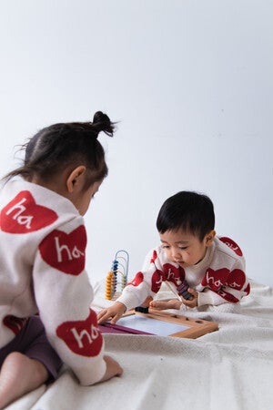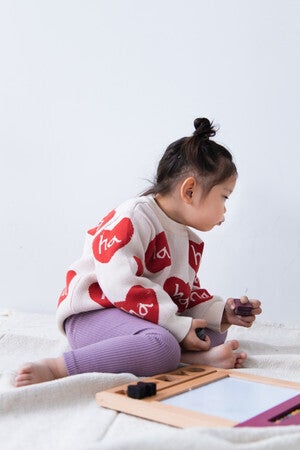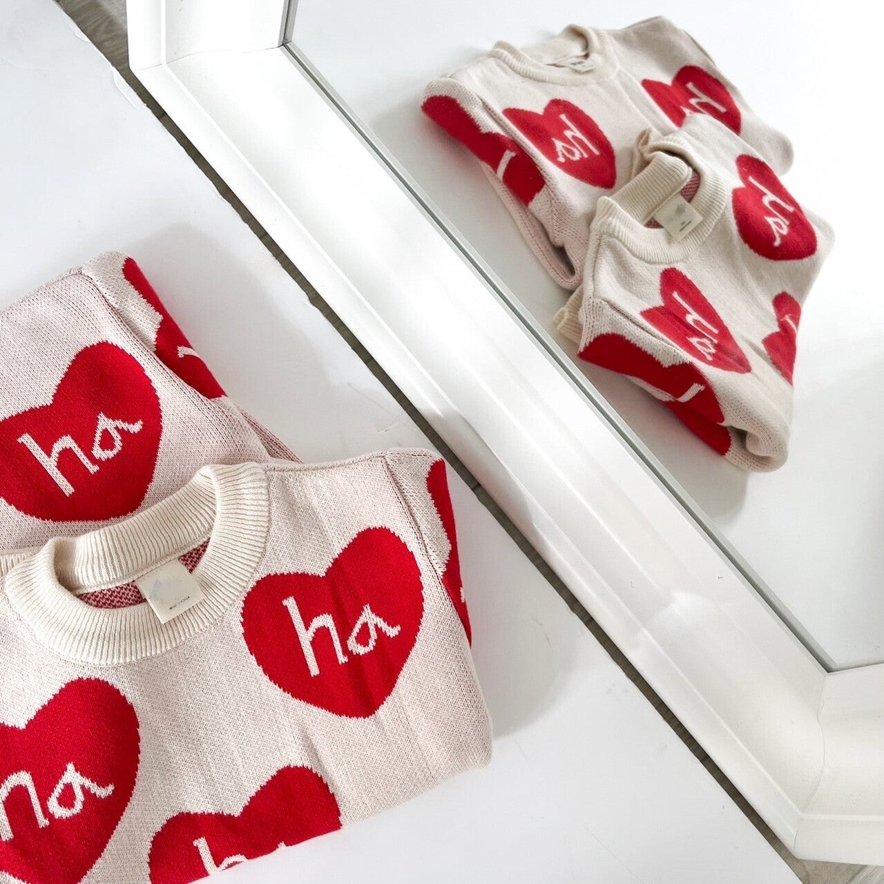 パッと目を引く可愛らしいハートのモチーフ!ベースが白なので派手すぎずお顔がパッと明るくなるような可愛らしいニットです!ゆるすぎずフィットしすぎず何に合わせても主役になる