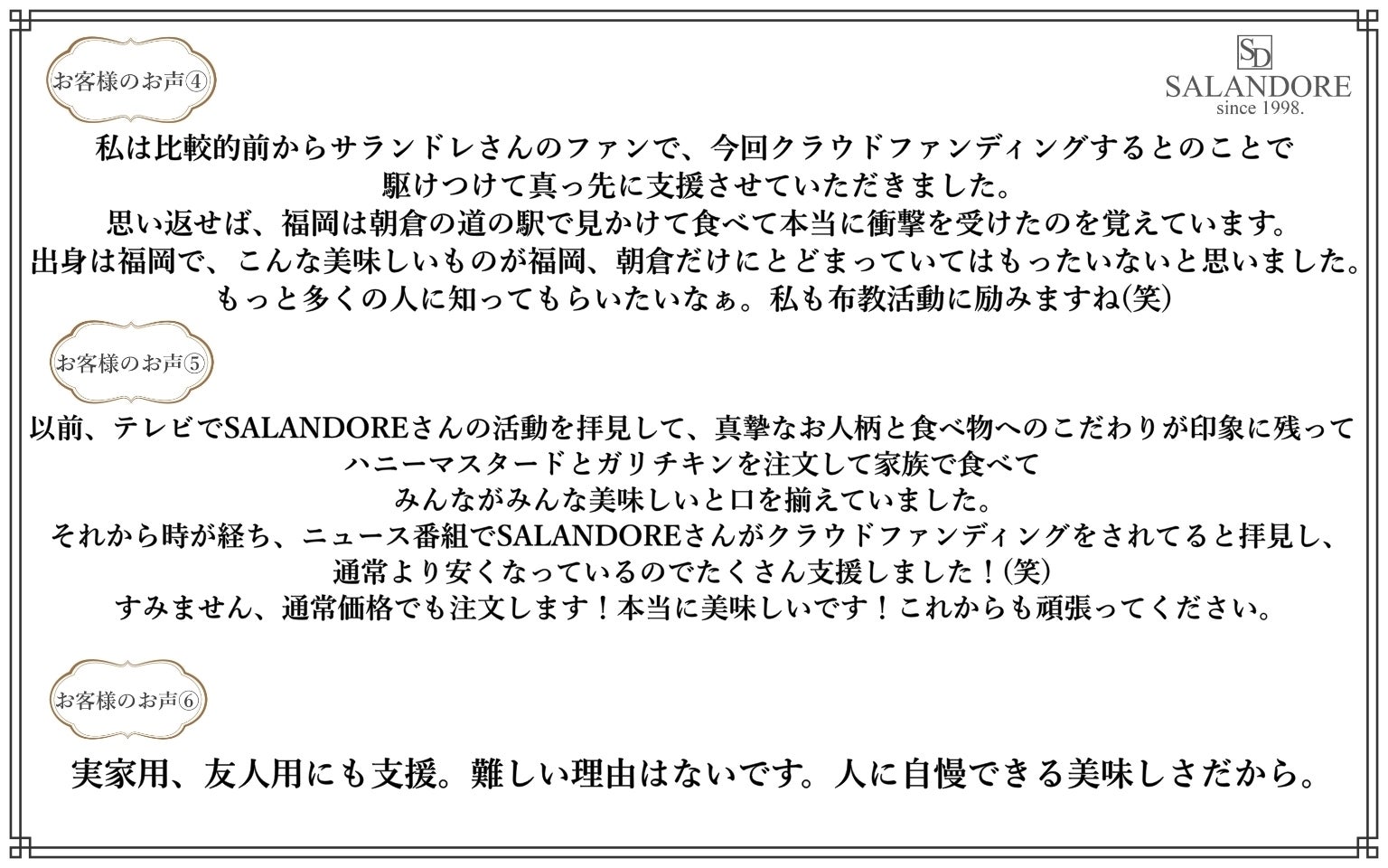 2023/12/17 11:36お世話になっております。福岡県の食品メーカー「サランドレ」の永田です。過去にご支援いただきまして本当にありがとうございました。ご支援いただいたことで今まで事業を続けてこれたこと、改めて心より感謝申し上げます。今回は、代表者の変更と新たなプロジェクトについての活動報告となります。●新たなプロジェクト【被災から復旧させ、父から思いを引き継ぎ、愛される味を存続させたい。】https://camp-fire.jp/projects/view/726445今年の7月に九州を襲った九州北部豪雨。福岡県内でも死者が出るなど、甚大な被害をもたらしました。この際に、材料や資材の保管庫である工場兼倉庫が浸水したことにより、保管していた材料及び資材の全ての処分を余儀なくされました。また、工場自体の床や壁の損害も深刻で、稼働し続けていくことが難しくなり、工場自体の稼働停止にまで追い込まれました。様々な負担が増大した結果、これまで事業を続けてきていた私の父が倒れてしまい、サランドレは完全に事業停止することとなってしまいました。そこから、なんとか事業を再開したものの、現在も工場は稼働停止のままとなっています。また、父が続けてきたサランドレについても、息子である私が完全に引き継ぎ、これから全身全霊で続けていくことを決意し今に至ります。とても厳しい状況が続いており、私自身としても厳しいスタートですが、諦めず出来ることを最後までやっていこうと思います。ただ、現実はとても簡単な状況ではなく、まずは工場の復旧・再稼働をしなければそもそも続けていくこともできない状況です。そこで、被災から復旧して工場を再稼働するために新たなプロジェクトを開始しました。●新たなプロジェクト【被災から復旧させ、父から思いを引き継ぎ、愛される味を存続させたい。】https://camp-fire.jp/projects/view/726445どうか、プロジェクトのご支援やお気に入り登録、周りの方に広めていただくなど、可能な範囲で結構ですので、どうかよろしくお願いいたします。また、過去にコロナ禍でも父が皆様にご支援いただいていたことを知り、今回の被災でもご支援をお願いすることは、気持ちとしては憚られました。今まで応援していただいていた方に申し訳ないという気持ちがありますが、私自身、覚悟を持って進めていく必要があると思い、本プロジェクトを遂行するに至りました。至らぬ点もあるかもしれませんが、全身全霊進めてまいりますので、応援・ご支援のほどどうかよろしくお願いいたします。ご不明やご支援もがございましたら、何なりとお申し付けください。それでは、最後まで全力で頑張って参りますのでよろしくお願いいたします。※通知が必要ないと感じた方は、メール通知を「受け取らない」に設定していただけますと幸いです。 もっと見る【おはようございます!ついに最終日となりました。】