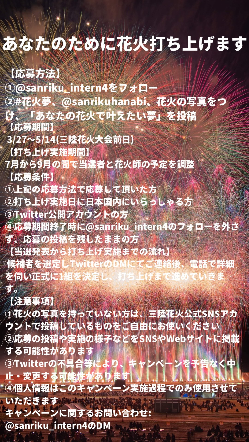 いよいよクラウドファンディング最終日となりました。これまでご支援いただいた皆様、本当に本当にありがとうございます!昨年10月の三陸花火大会よりも苦戦を強いられておりますが、それでも私たちは感謝と元気を心が晴れるようなエンターテイメントをお届けします!当日の配信スケジュール・使用楽曲・『世界に届け!Thank you from Tohoku キャンペーン 』などについては、上記リンクにありますので要チェックです!そして5月15日に行われる『無観客花火』にかける想いを、実行委員長の浅間よりお伝えさせてください。ーーーーーーーーーーーーーーーーーーーーーーーーーーーーーーーー昨年10月の配信は、大金使ってインフラ整え、大人数のスタッフを現地に呼び、最高の環境で番組配信しました。今回は、緊急事態宣言という事もあり限られた環境で番組配信をします。でもこれだけの事はやります↓・8種類のプラットフォームから同時配信します・今回もドローンからの映像も配信します・ドローンは4機飛ばします・MCがいる東京の配信スタジオを拠点とします・ゲスト出演者は海外や全国からも出演してもらいます(※ゲストはまだまだ募集中です)・脆弱な通信インフラで繋ぎます・配信カメラはほぼスマホのみ(台数数え切れません)・アフタームービーは4Kで作ります・360°カメラで9台使います(後日公開)・今回も360°カメラをドローンに搭載します(後日公開)・今回もドローンが花火の中に突っ込みます(後日公開)などなど、プレスリリースには書き切れない事が沢山あります。中止発表してから短期間、なんでもかんでも企画に詰め込みました。5/15(土)本番までに完璧な準備は出来ないと思います。沢山失敗すると思います。でもコロナだからこそ普段だったら絶対にしないチャレンジが出来ると思いますし、その経験が未来に繋がると思っています。当日の失敗も含めて、番組配信や後日公開されるコンテンツを楽しんでもらえればと思います!