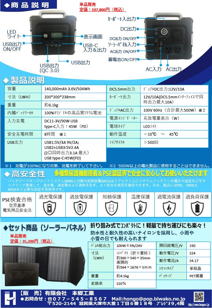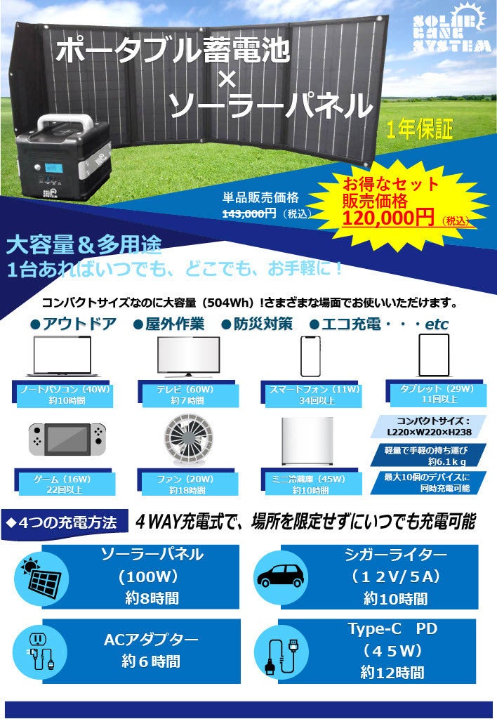ここ数年、日本でも、台風やゲリラ豪雨による「水害」東北地方、九州地方、近畿地方でも最近頻繁に発生する「地震」天災は忘れた頃にやってくるといいますが、忘れないうちに日本全国で起こっています。そんな中心配なのが「インフラ」その中でも普段当たり前のように使っている「電気」ベトナムでも毎年のように台風による被害で停電は日常茶飯事だとか。今回返礼品にソーラーパネル&ポータブル蓄電池をご用意しました。ACアダプターでの充電は勿論ですが、今回はソーラーパネルをセットで。電気の供給がなくても太陽光で充電ができます。いまや国民生活生欠かせないスマホ、PC等の充電は勿論、小型冷蔵庫(45W)テレビ(60W)等にもご使用いただけます。(100Wまで)蓄電池も重量は約6Kgと持ち運びにも便利ですので、災害時は勿論、アウトドア、BBQ等の行楽でも大活躍間違いなしです。今回は単品で揃えると143,000円をセットで120,000円。そこからさらに20,000円引きの100,000円(税込)で100,000円ご支援の返礼品とさせていただきます。みなさんのご協力ご支援の程宜しくお願いいたします。 もっと見る