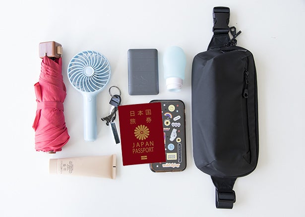 スマートフォン、パスポート、財布、折り畳み傘、 扇風機、鍵などをたっぷり入れて、両手フリーで手軽に外出することができます。