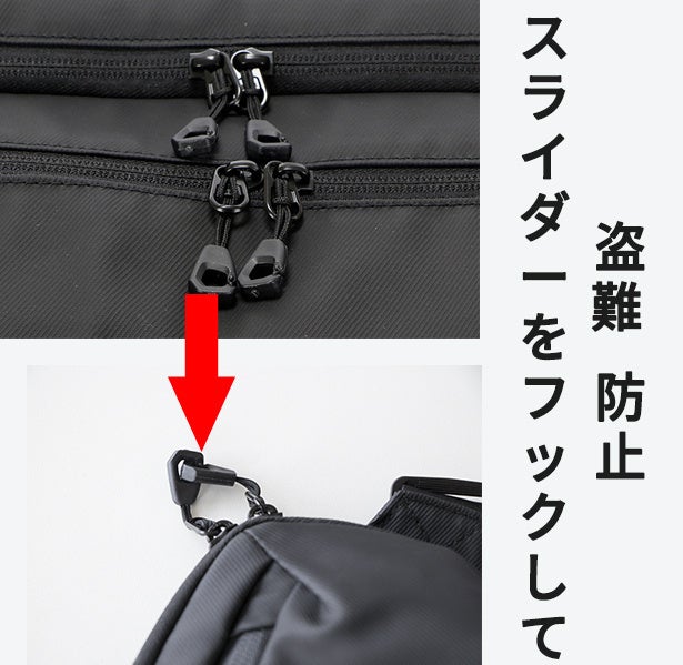 メインジッパーのスライダーをお互いにフックすることで、バッグの中身を安全に守ることができます。盗難防止のスライダーで 安心・安全
