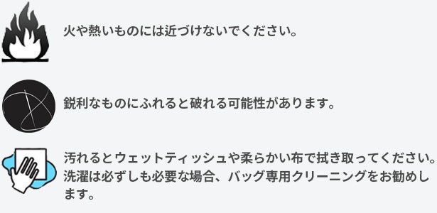 A2:あくまで表素材の撥水加工とジッパー部分の防水なので、むやみに水に濡らさないように取り扱いにはご注意ください。