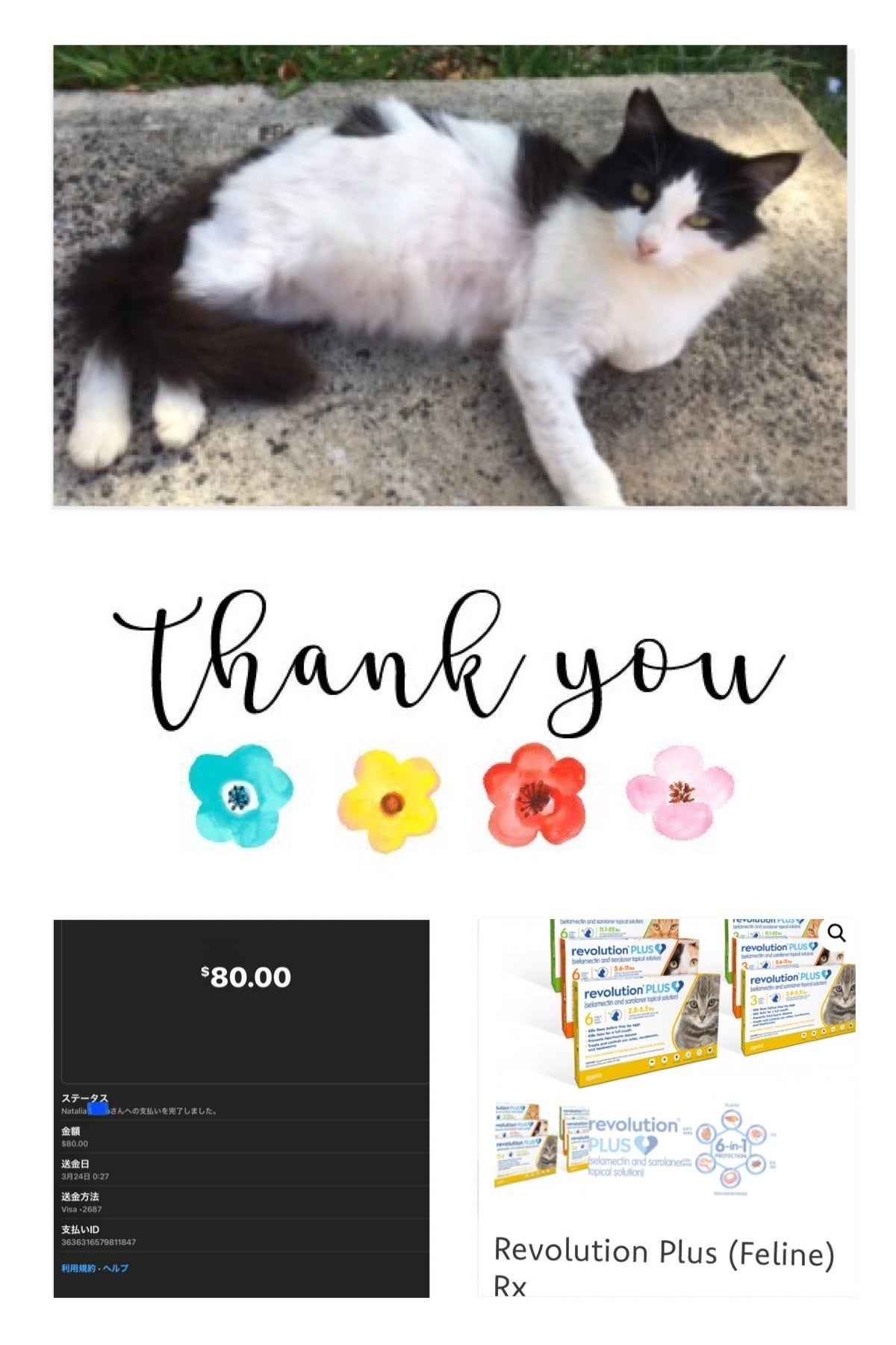 他にも皮膚に問題がある猫達がいるので、”Revolution Plus” 4本を猫ランティアNPO団体の”ナタリア”さんから安く譲ってもらうことにしました。