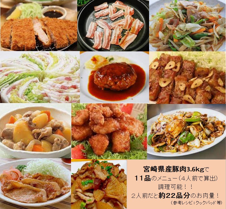 例えば下記メニューだと4人前で約11品調理できます。2人前だとお肉が半分量で済むので約22品調理できます。様々なレシピでアレンジして宮崎県産豚肉をお召し上がりください。