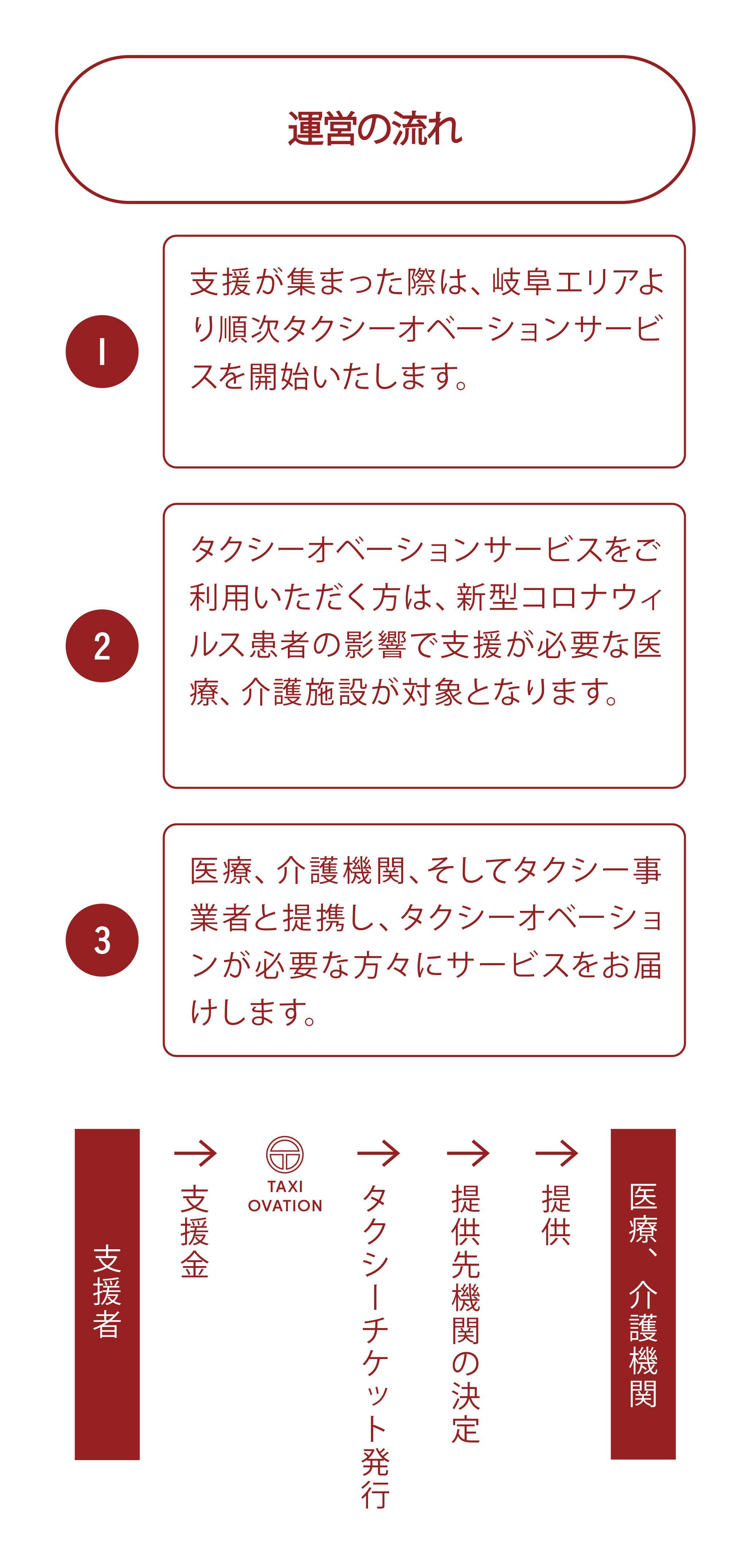 現在新型コロナウイルス感染拡大の影響を受け、全国の医療、介護現場で働く方々への負担は従来とは比類できないほど増大しています。また同時にタクシー事業者は利用者が激減し、大打撃を受けています。特に弊社が運行している岐阜市は、大都市圏の愛知県名古屋市から電車で20分程度の距離にあるため、コロナの影響を特に強く受けてきた地方都市です。