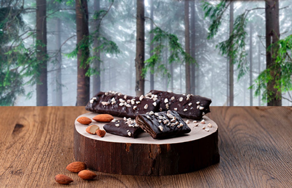 ミルクショコラを中心に上下に3層ずつ重ねたサクサクのミルフィーユ生地にチョコを纏わせ、さらにその上に果実やナッツをトッピングした贅沢なお菓子です。