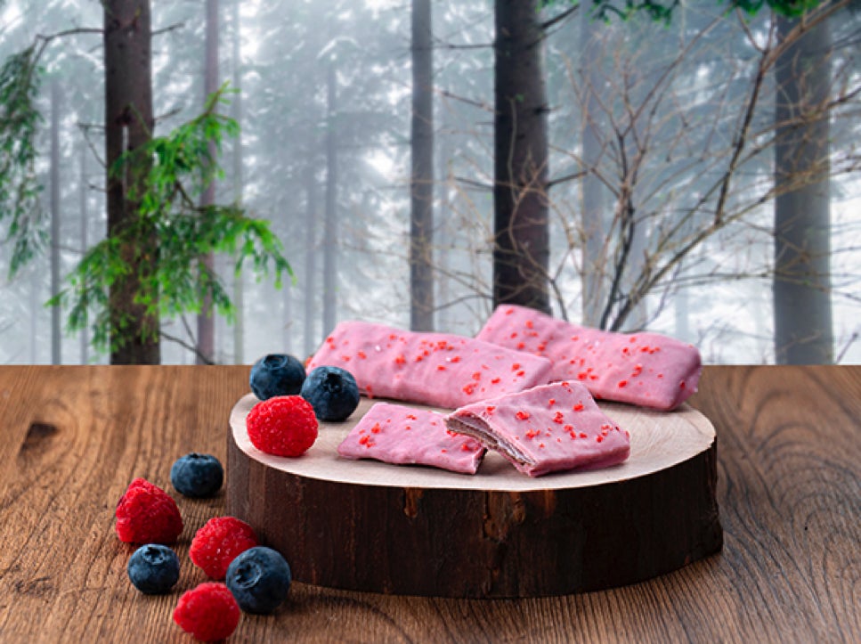 ・ミルクショコラを中心に、ブルーベリーを使用したサクサクのミルフィーユ生地を重ね、その周りにはラズベリーを使用したチョコを纏わせました。トッピングにはストロベリーを使用しており、3種のベリーを味わうことができる贅沢なショコラミルフィーユに仕上げました。ベリー好き、イチゴ好きにはたまらない甘酸っぱいお菓子です。