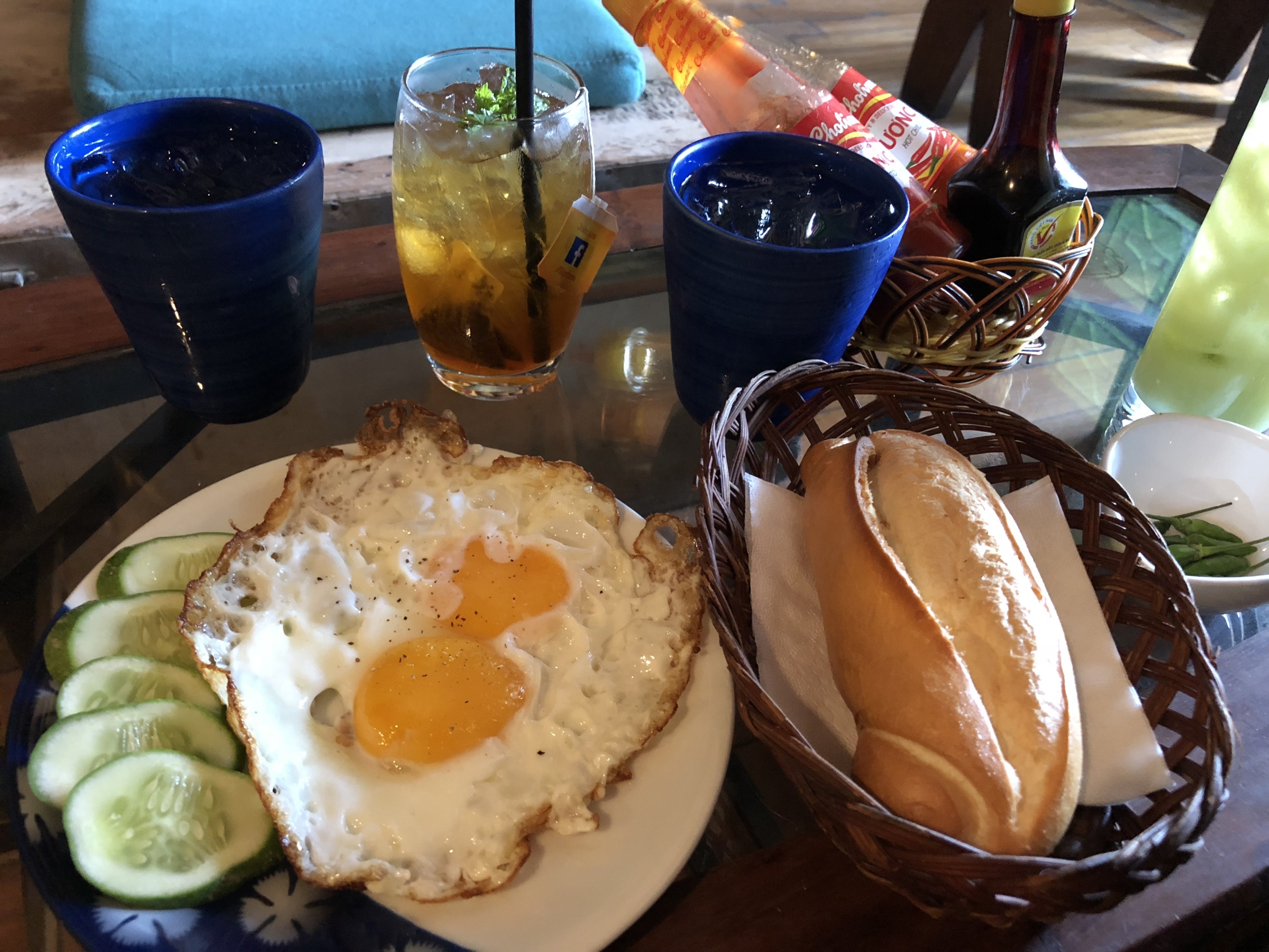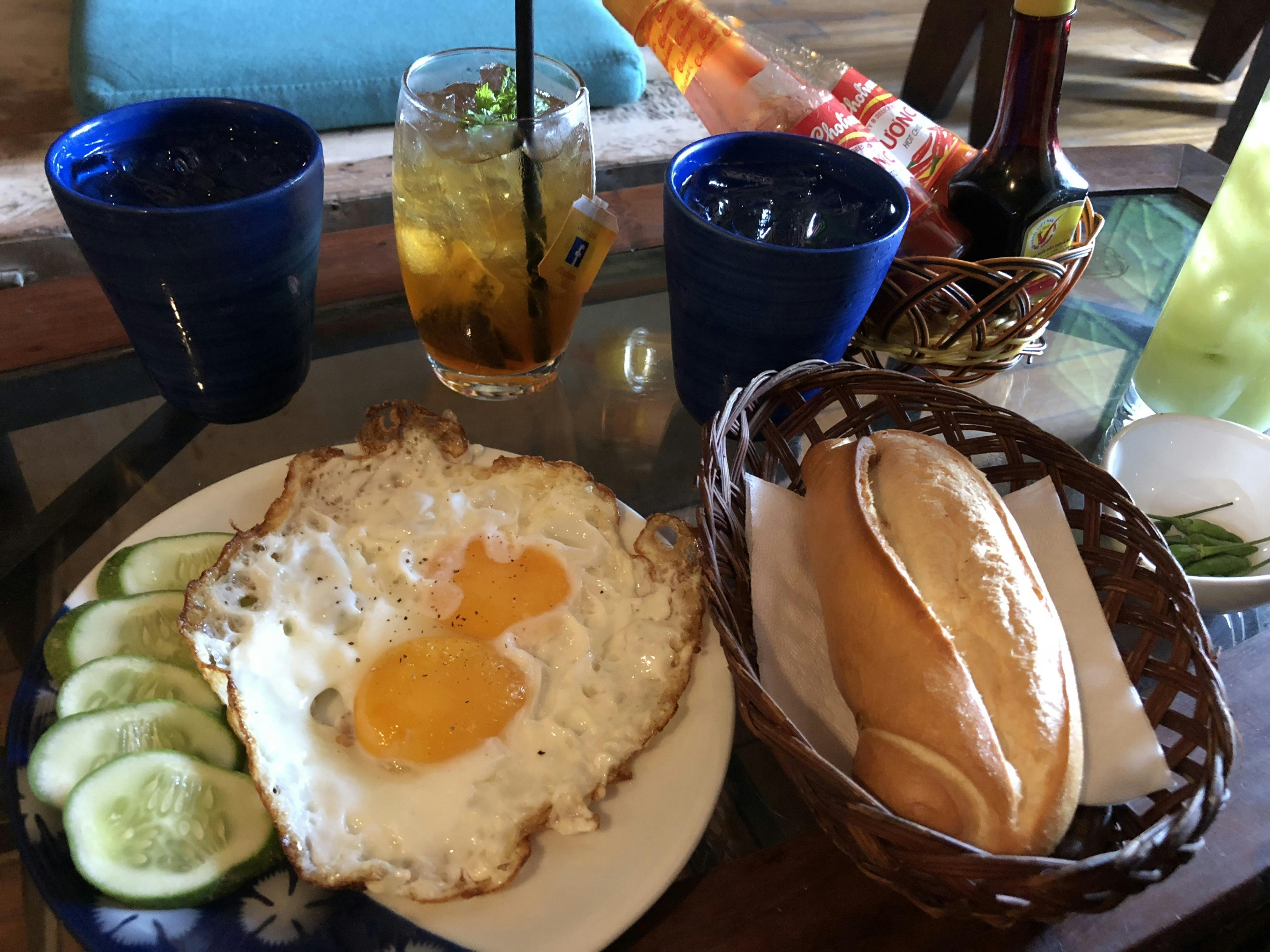 ベトナムでは、この様にフランスパンに固めに焼いた目玉焼きと、きゅうり、パクチーなどを入れてチリソース、ベトナム醤油をかけて食べるのが人気な朝ごはんです。