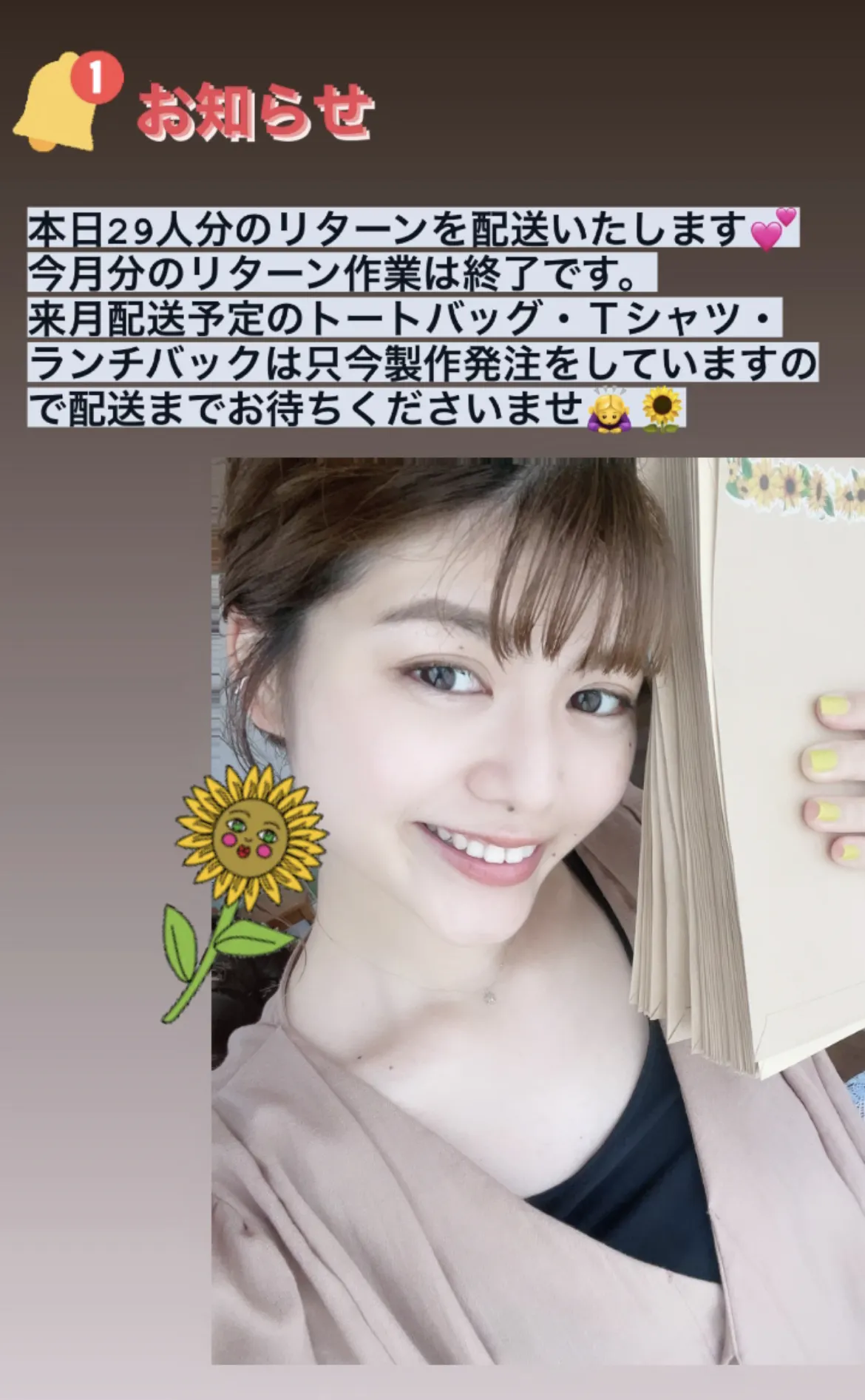 トートバッグ・Tシャツ・ランチバックのリターンにつきましては、今 製作発注をしていますので、予定通り来月までには配送致します。