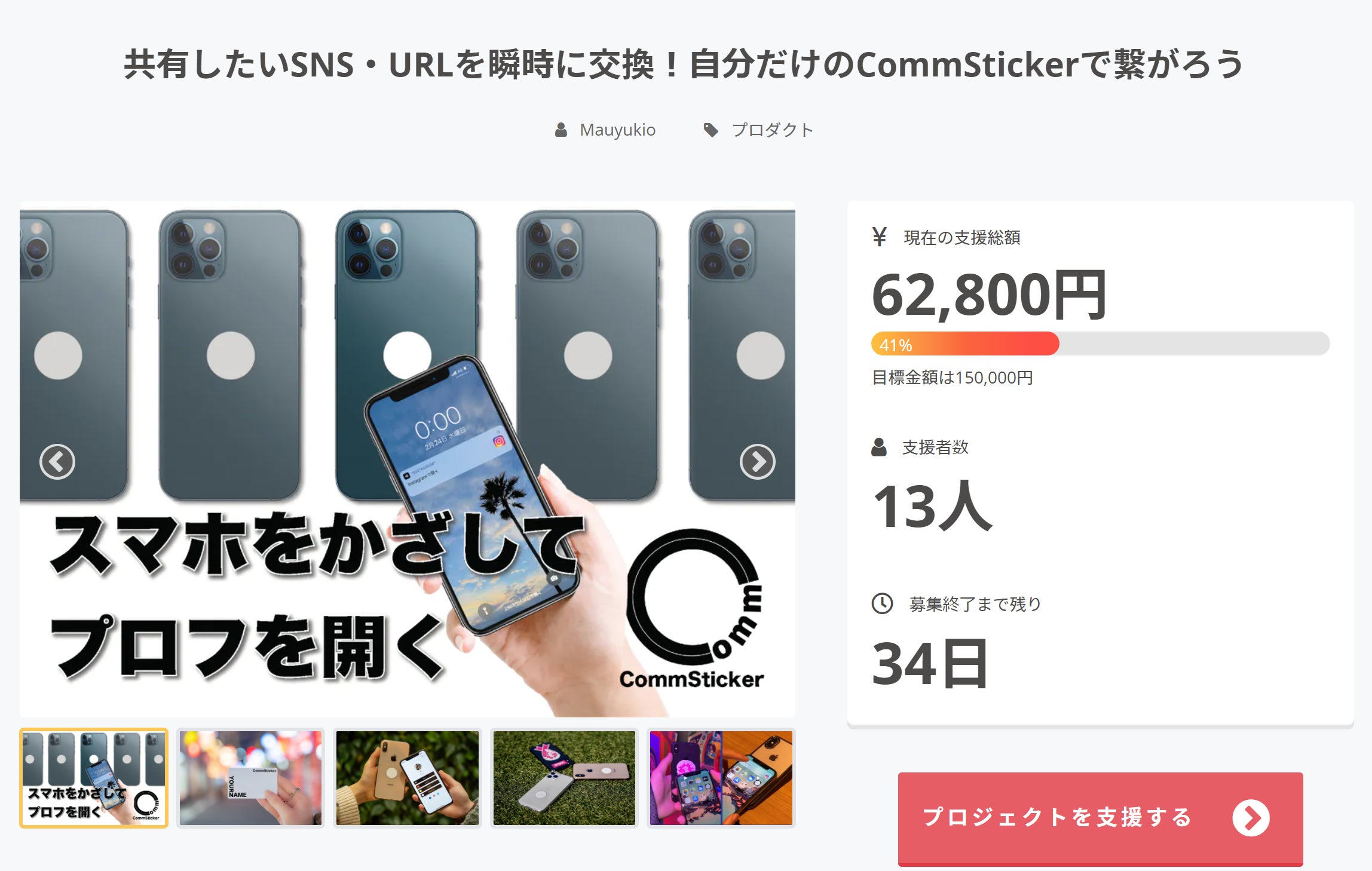2021/05/09 13:44こんにちは。プロジェクトリーダーの瀬川と申します。皆様からご支援と宣伝のご協力をいただき、無事に100%を達成することが出来ました。ご支援いただいた皆様、心より感謝申し上げます。しかしここで気を緩めるのではなく、残り10時間、更に達成率を更新していけるよう、精一杯頑張りたいと思います。これからの活動をさらに良いものとするため、CommStickerの活用場所を広めていくためにも皆様からのご支援とご協力まだまだお待ちしております。何卒よろしくお願いいたします。 もっと見る