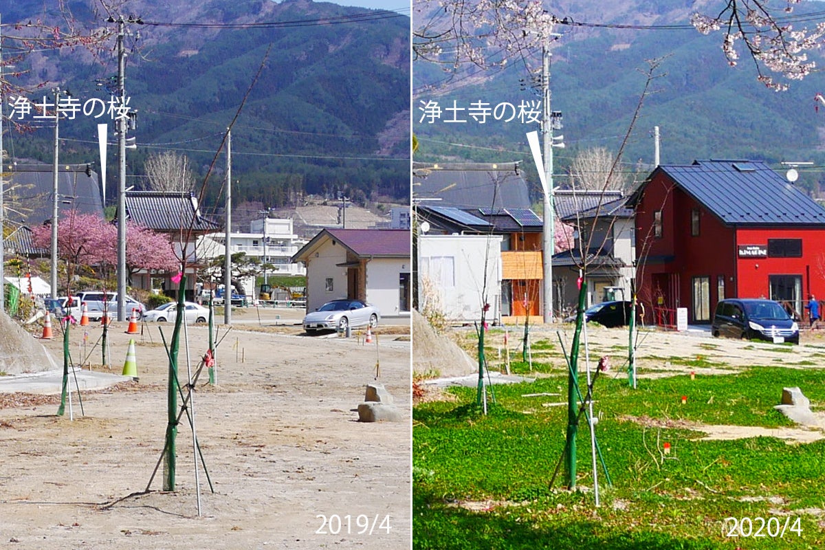 冨山さまのご自宅兼店舗は津波で流失後、2019年4月頃ご自宅を、同年8月頃には店舗をかさ上げ地に再建されました。再建されたその場所からは、桜ライン311が植樹した浄土寺の桜がよく見えましたが、周囲の住宅再建により浄土寺の桜は直接見ることが難しくなりました。とは言え、歩いていける距離です。