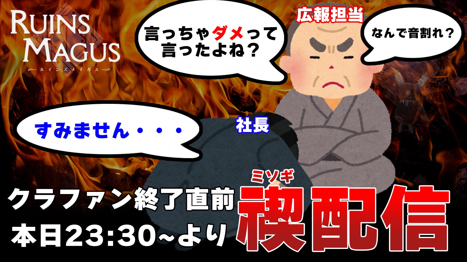 RUINSMAGUS広報担当です。突然ですが本日23:30より、生配信を行うこととなりました。配信URL:https://youtu.be/zGjPBBPdKqUクラウドファンディングが本日の23:59に終了することもあり、その時間を皆様と迎える。初めて私たちが挑戦したクラウドファンディング、ユーザーの方と直接向き合い、声を聴くとても良い経験ができた。・・・という内容の配信予定でしたが、この1ヵ月程、社長が行ったことを皆様ご存じでしょうか?勝手に情報をお漏らししてしまったり・・・。先日行った放送では、開始直前~放送中もしきりにマイクを触り、音が割れてしまっていたり・・・。なにやってるんですか!社長!!!こんな状態で、プロジェクトメンバー(主に私)が納得できるのでしょうか!?・・・社長に当時の心境・音が割れて説明不足だった部分を再度説明いただき、"禊"とさせていただきます。皆様にはこの"禊"と"クラウドファンディング終了の瞬間"に是非立ち会っていただきたく。活動報告をさせていただくまでに至りました。皆様本日はどうぞよろしくお願いいたします。