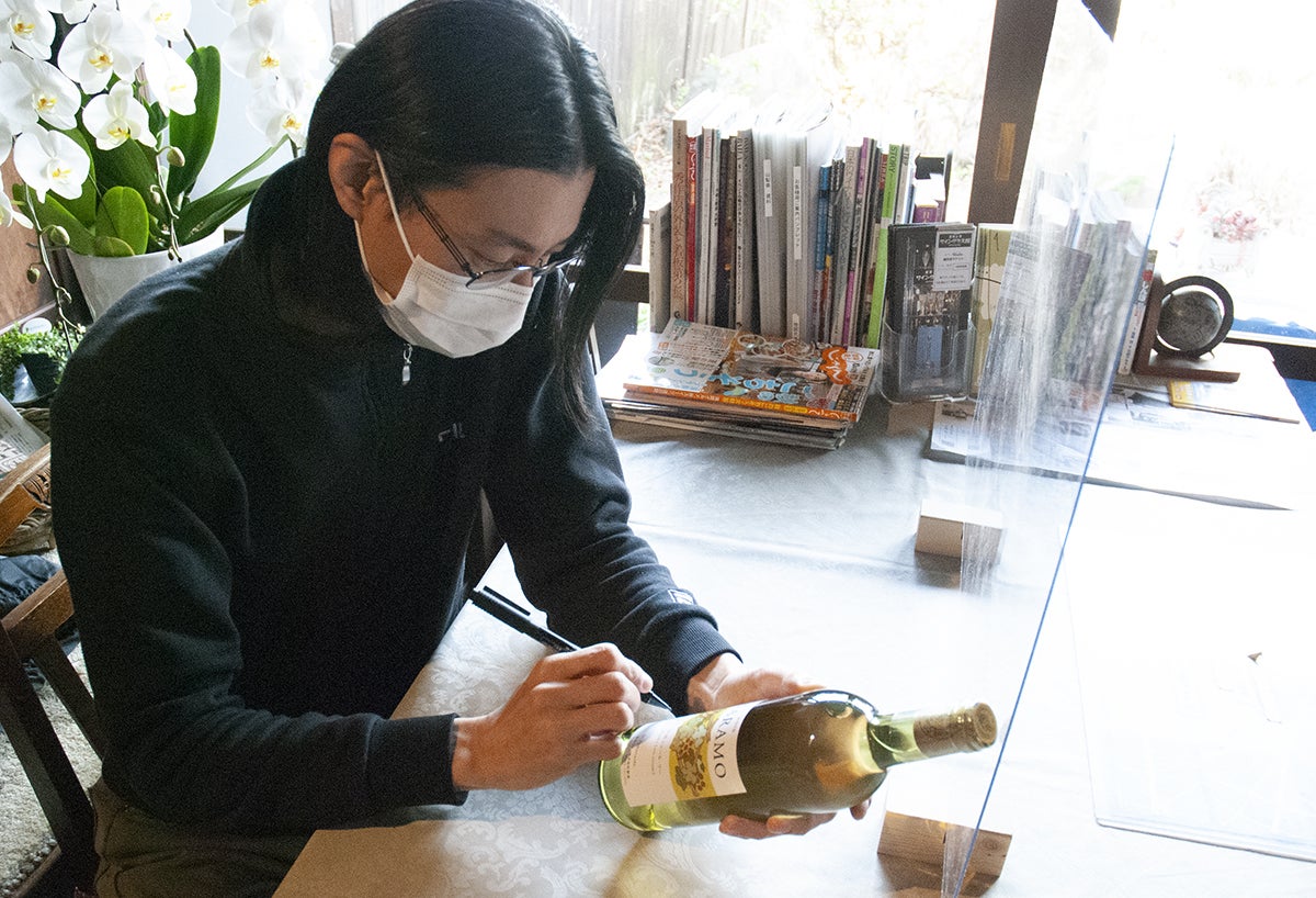 10000円以上のリターンではワインをお届けするのですが、皆様に、より感謝の気持ちをお伝えしたいということから、全てのワインに醸造家のサインを入れることにしています。市販品との違いを出し、少しでも皆様に喜んでいただけたらと思っています。写真は真剣な表情でサインを描く、勝沼ワイナリーズクラブの山崎会長(原茂ワイン)です(^_^)
