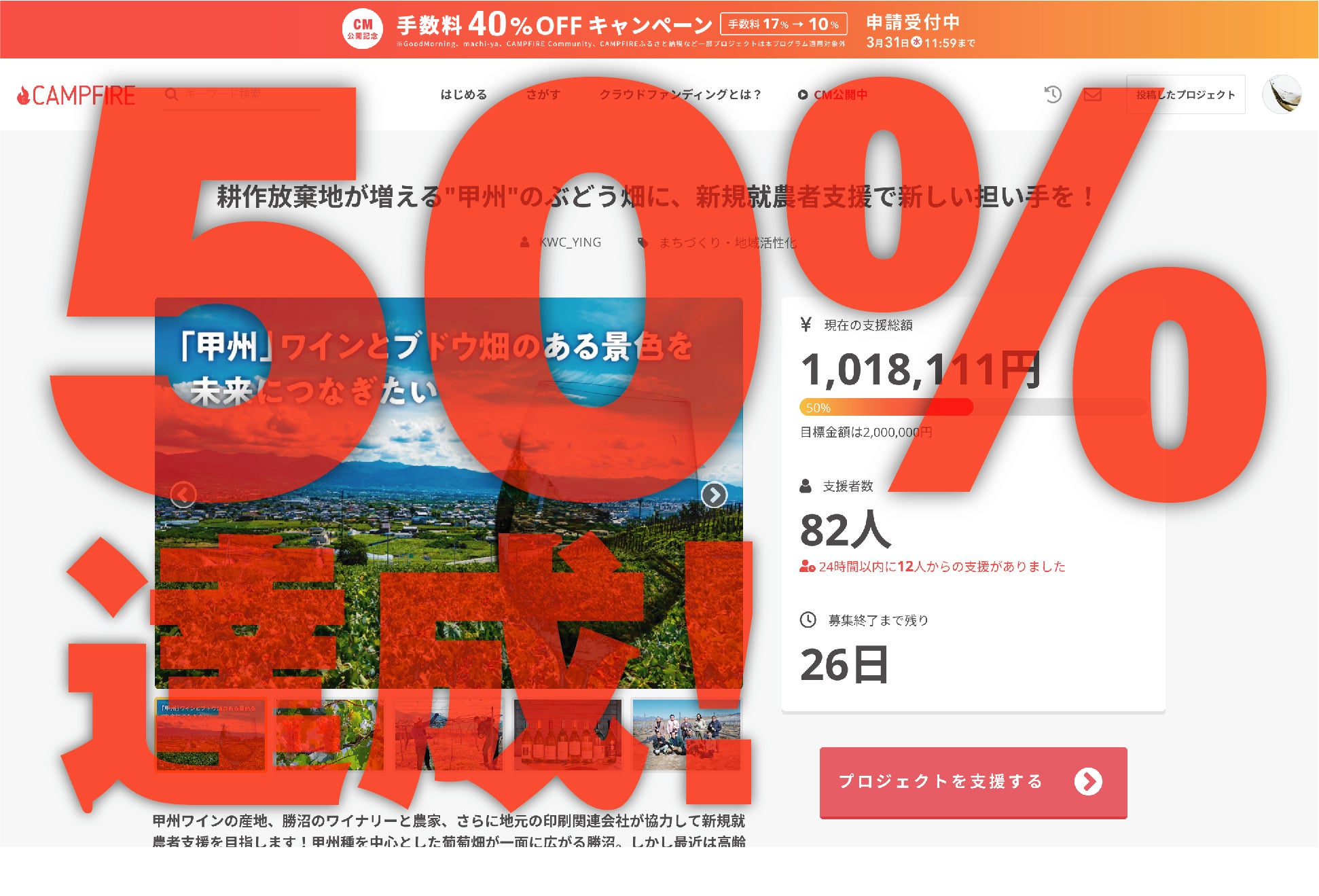 スタートから6日目、3/20お昼の時点で目標金額の50%である100万円のご支援を頂戴しました!! ご支援くださった皆様、ありがとうございます。