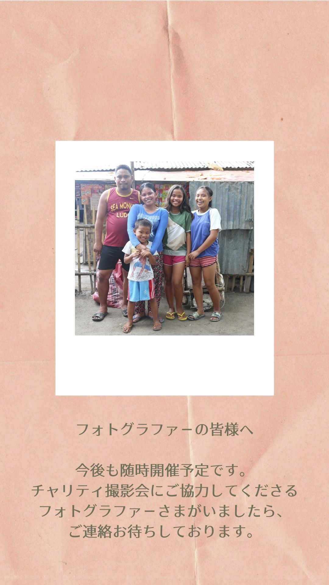 日本のフォトグラファーさんに日本の家族写真を撮る協力をしてもらい、それがしいてはフィリピンへの支援にもなったら、撮る側も撮られる側も両国みんながハッピーではないか!