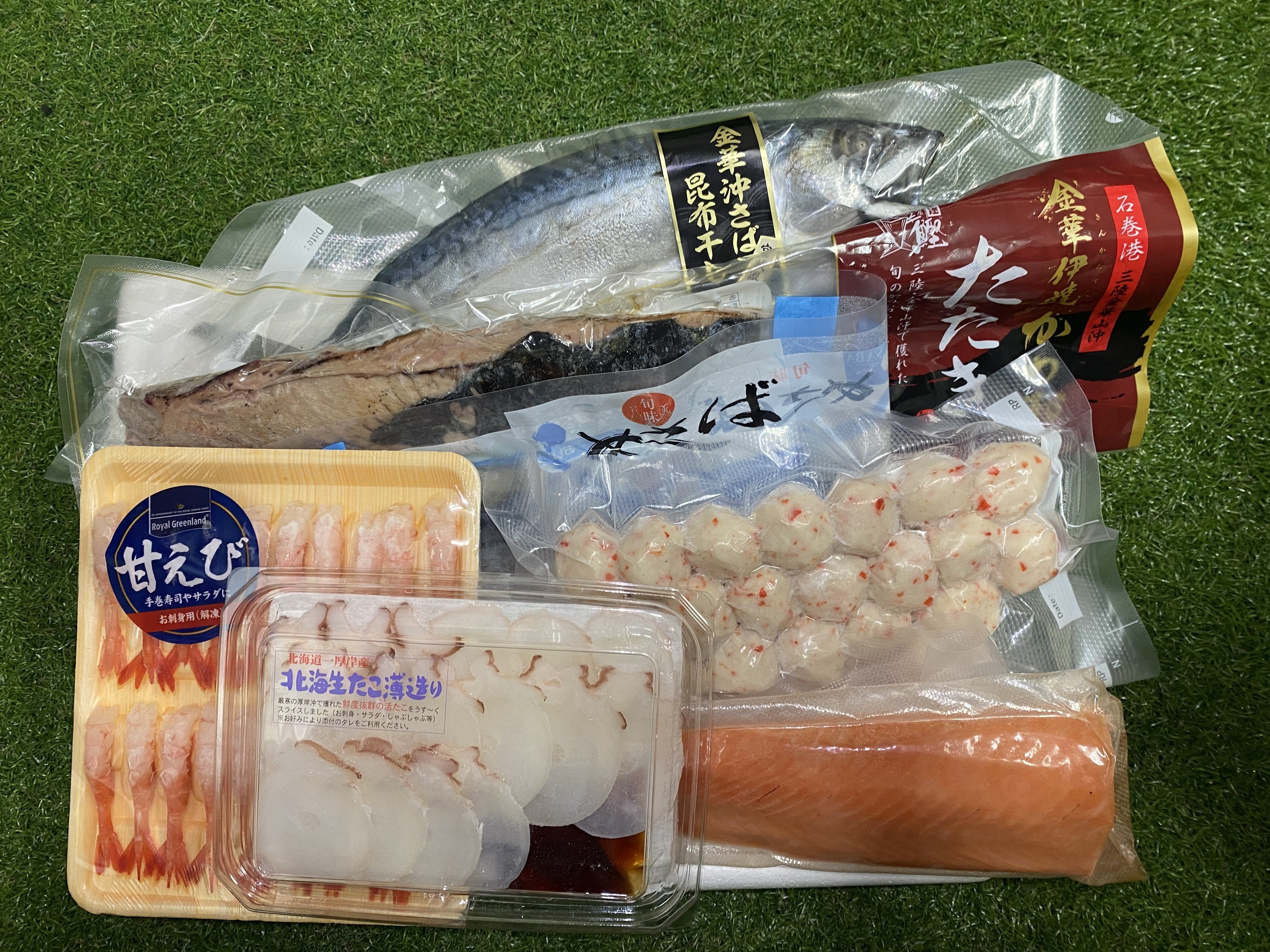 主に宮城県で獲れた新鮮な魚介類、また他県から取り寄せた選りすぐりの商品を詰め合わせてお届けします。
