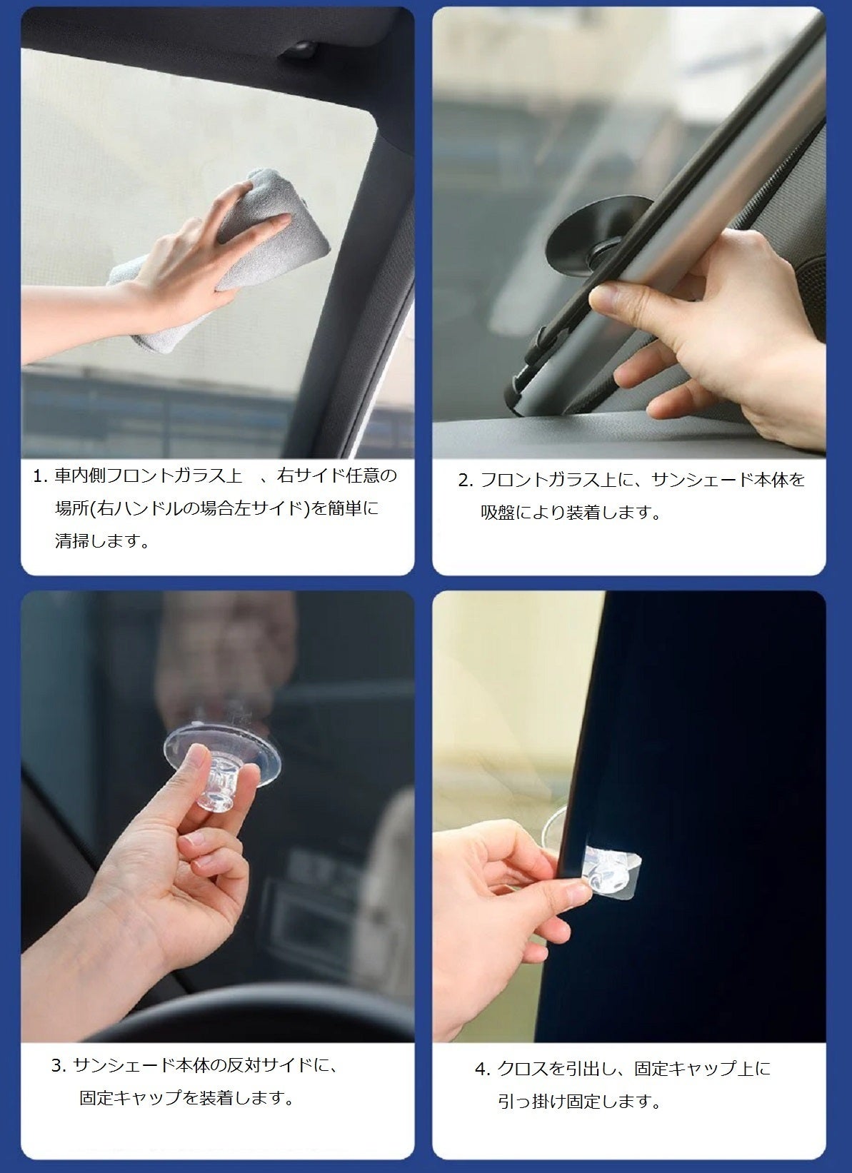 サンシェード本体とクロスが一体化している為、フロントガラス上への装着が非常に簡単にできます。クロスは「一枚物」のシームレス、完全な遮熱効果を実現すると共に、車外から見た外観も非常にスタイリッシュ、スマートです。