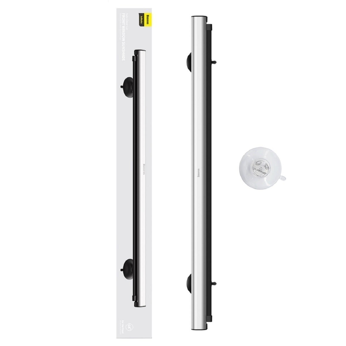 サンシェード本体は、以下の写真の様に、一本の棒状の形態になります。この中に、クロスが格納されており、これを引出して固定、また収納時は固定を外せば自動的に巻き取られます。(自動格納式) 非常にシンプル、スマートな取り扱いを実現しています。(下写真は左ハンドルの場合です。右ハンドル時は、フロントガラスの助手席側、左サイドへの装着となります)