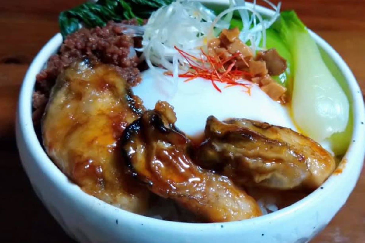 写真はごはんに牡蠣ラー油と牡蠣ラー油の牡蠣と半熟卵などをのせて牡蠣丼をつくりました