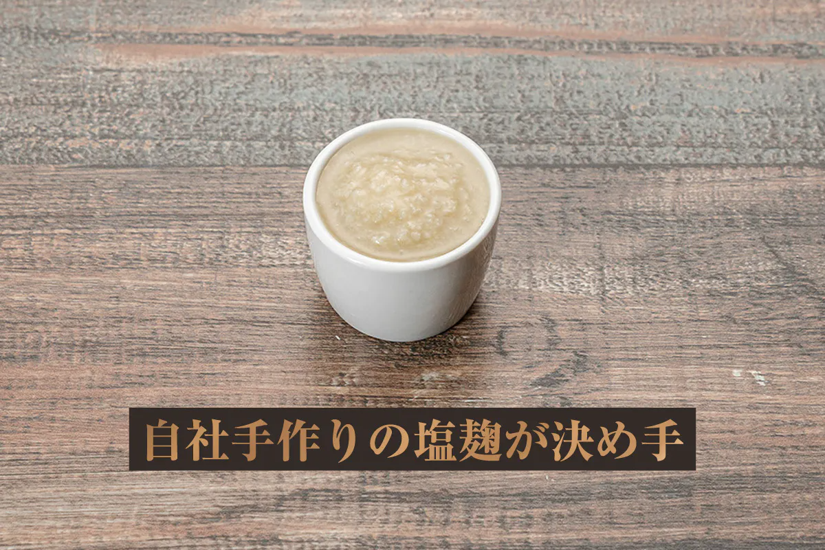 その蔵付き麹菌と自然栽培米を発酵させて出来た米麹に、名水名高い福井県大野市の湧き水と越前海岸の天然塩「百笑の塩」を使用して、 ハンバーグ作りの為だけにこだわりの塩麹を自社で製造しています。