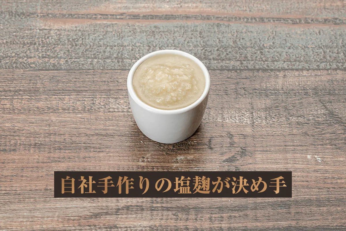 ひと味惚れハンバーグの味を決定付けるのが自社手作りの塩麹。農薬などを使わないとても自然な環境で作られた「自然栽培米」に福井県越前市のマルカワ味噌さんによる日本で唯一の「蔵付き麹菌※」を加え発酵させたものです。