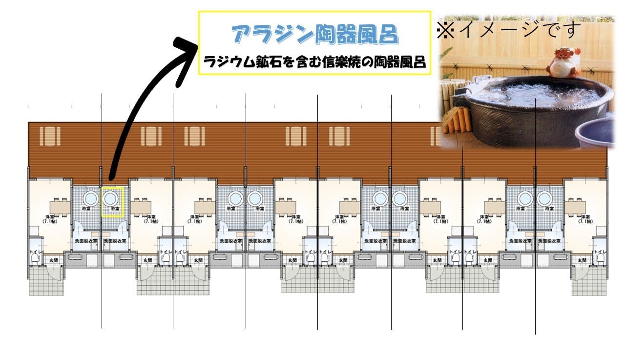 また、当施設は大自然に囲まれた中で澄んだ空気をすいながら、信楽焼きのアラジン陶器風呂を楽しんでいただます。