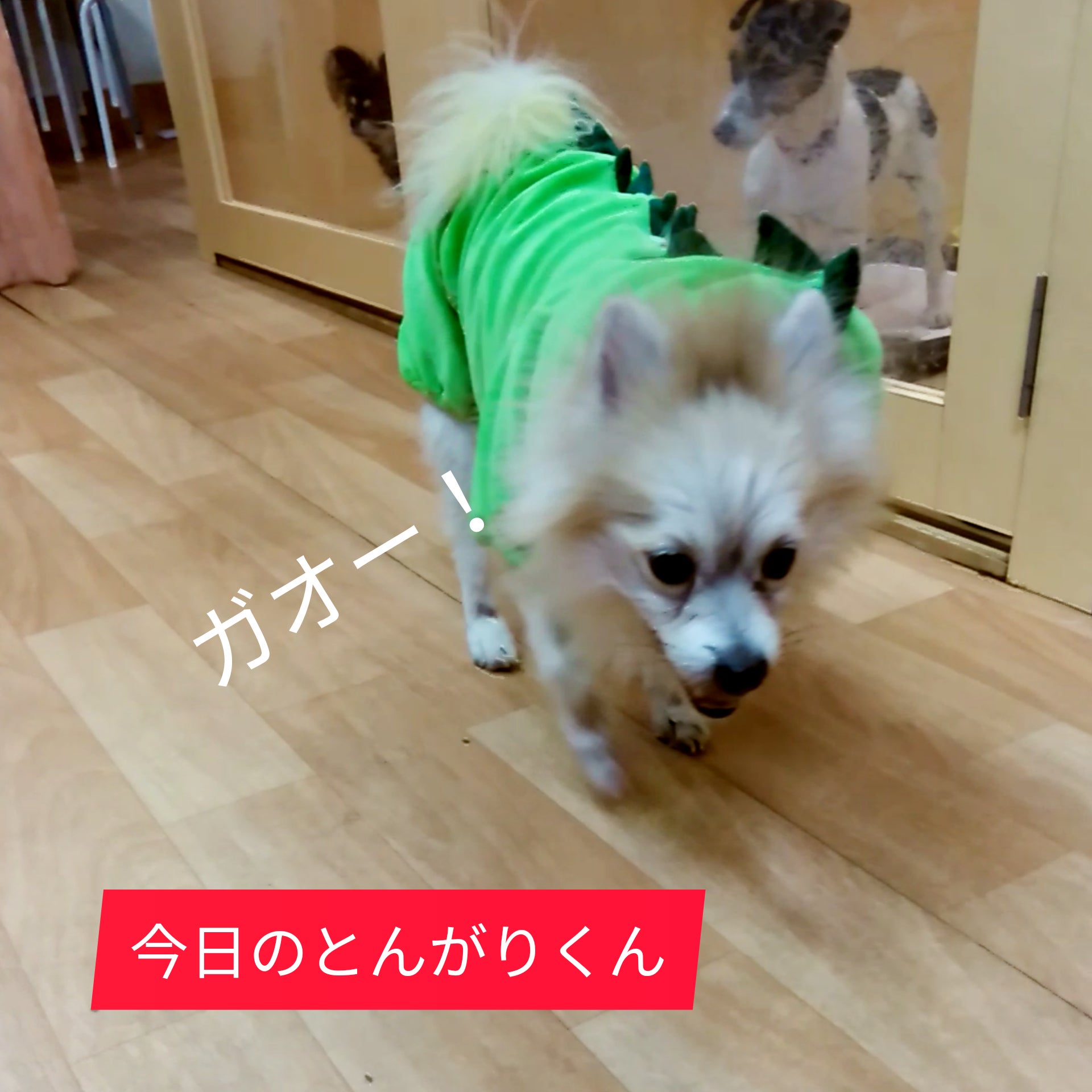 今日のとんがりくんは、ご寄付でいただいた恐竜のお洋服を着ています。