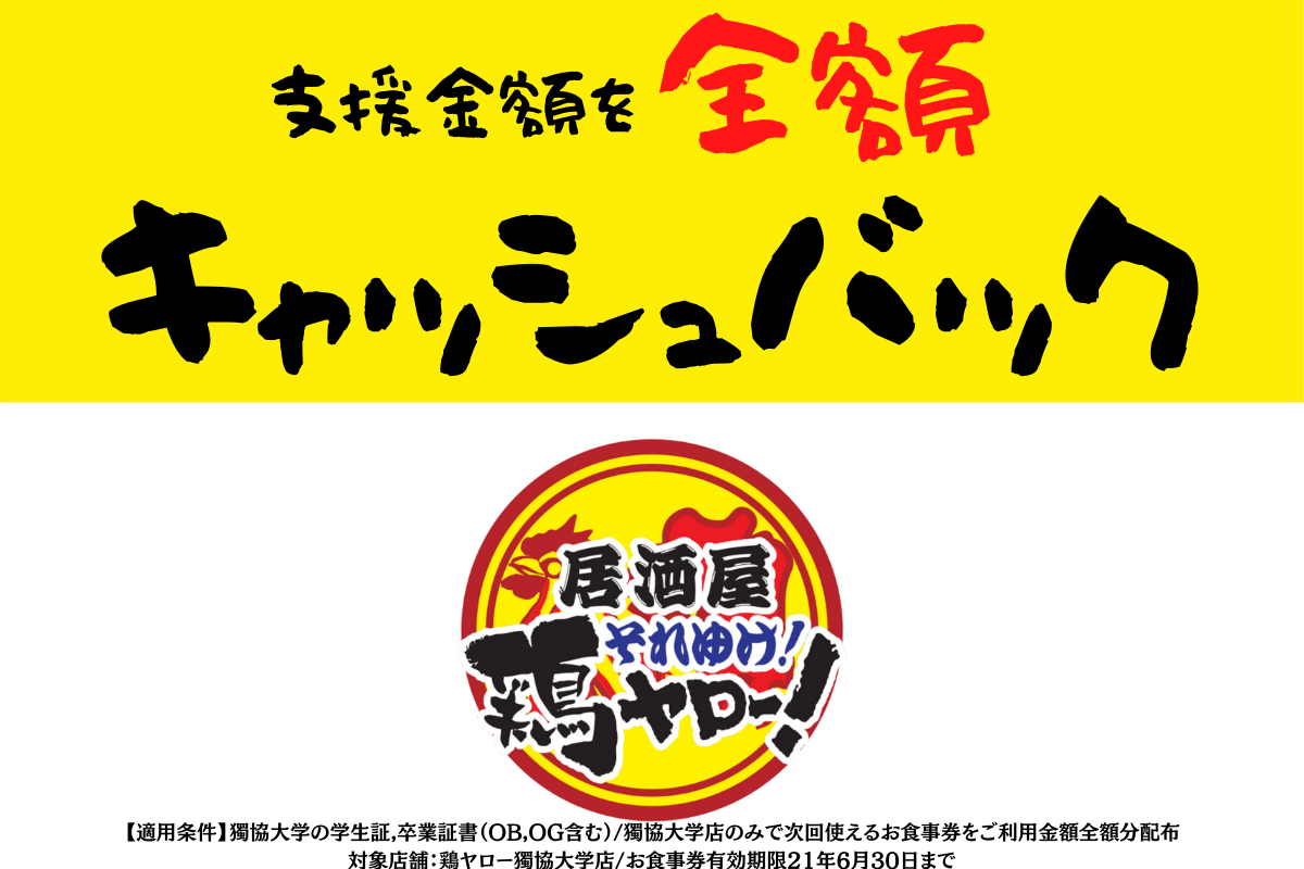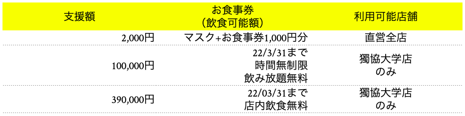 本来クラウドファンディングは資金を集め、その資金を自分たちの事業に投資したり活用したりするものだと思います。今回我々は相思相愛である「獨協大生」に恩返しするのが目的なので、皆様からご支援頂いた【全額】を獨協大学店にて飲食できる権利として獨協大学店にてご利用頂けるお食事券を提供、配布致します。(権利行使の条件:獨協大学在学、既卒の方で、ご来店時に獨協大学の学生証または卒業証書を提示。当日のお会計全額分、次回獨協大学店にてご利用頂けるお食事券を進呈致します。お食事券有効期限は2021年6月30日まで)