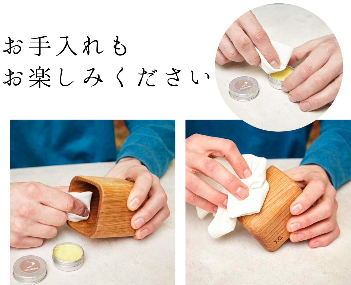 付属の蜜蝋クリームでお手入れすることで、磨くほどに艶が出、より上質な外観に。
