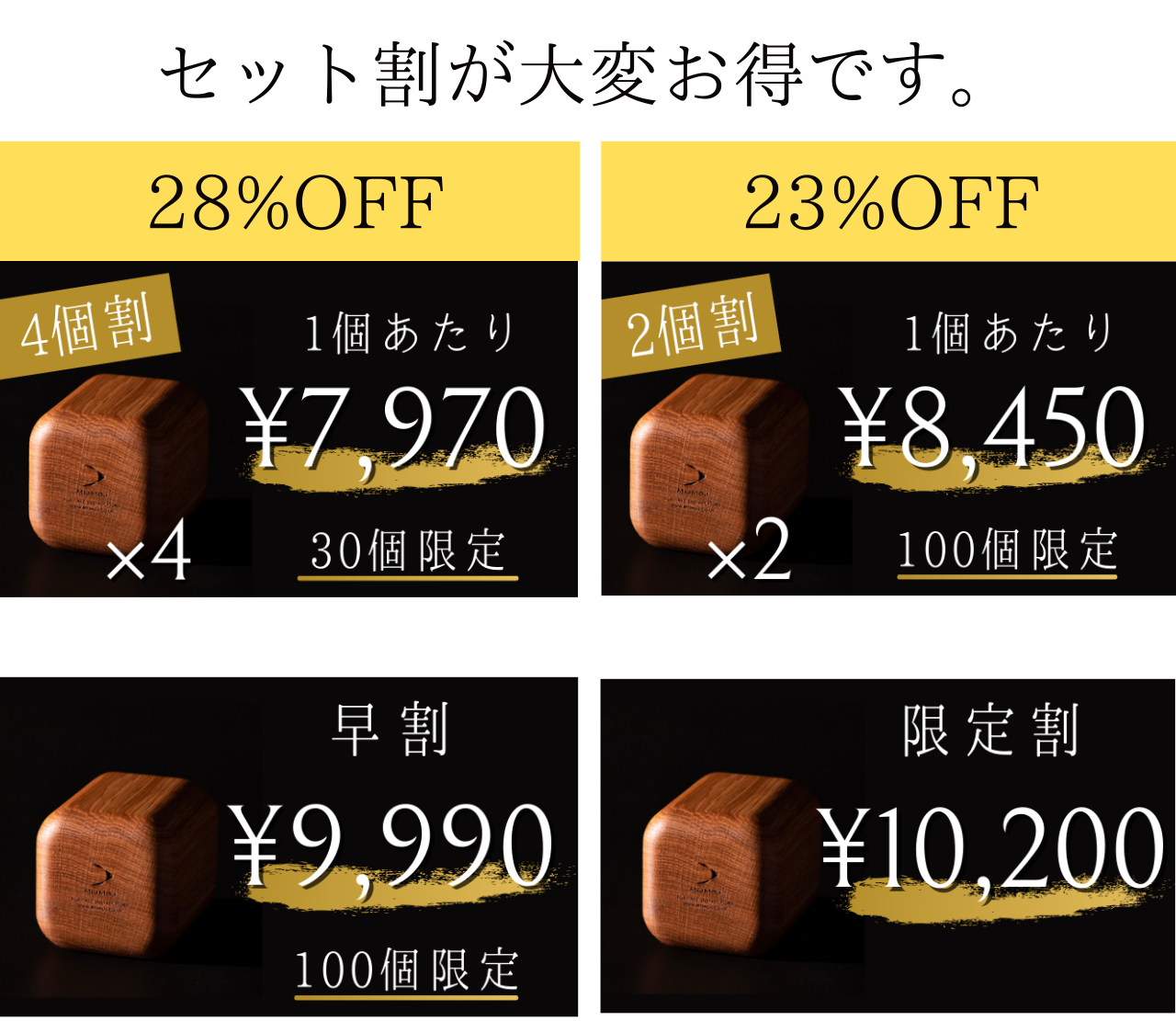 4個セットは1個あたり28%OFFの7,970円、2個セットは23%OFFの8,450円から。