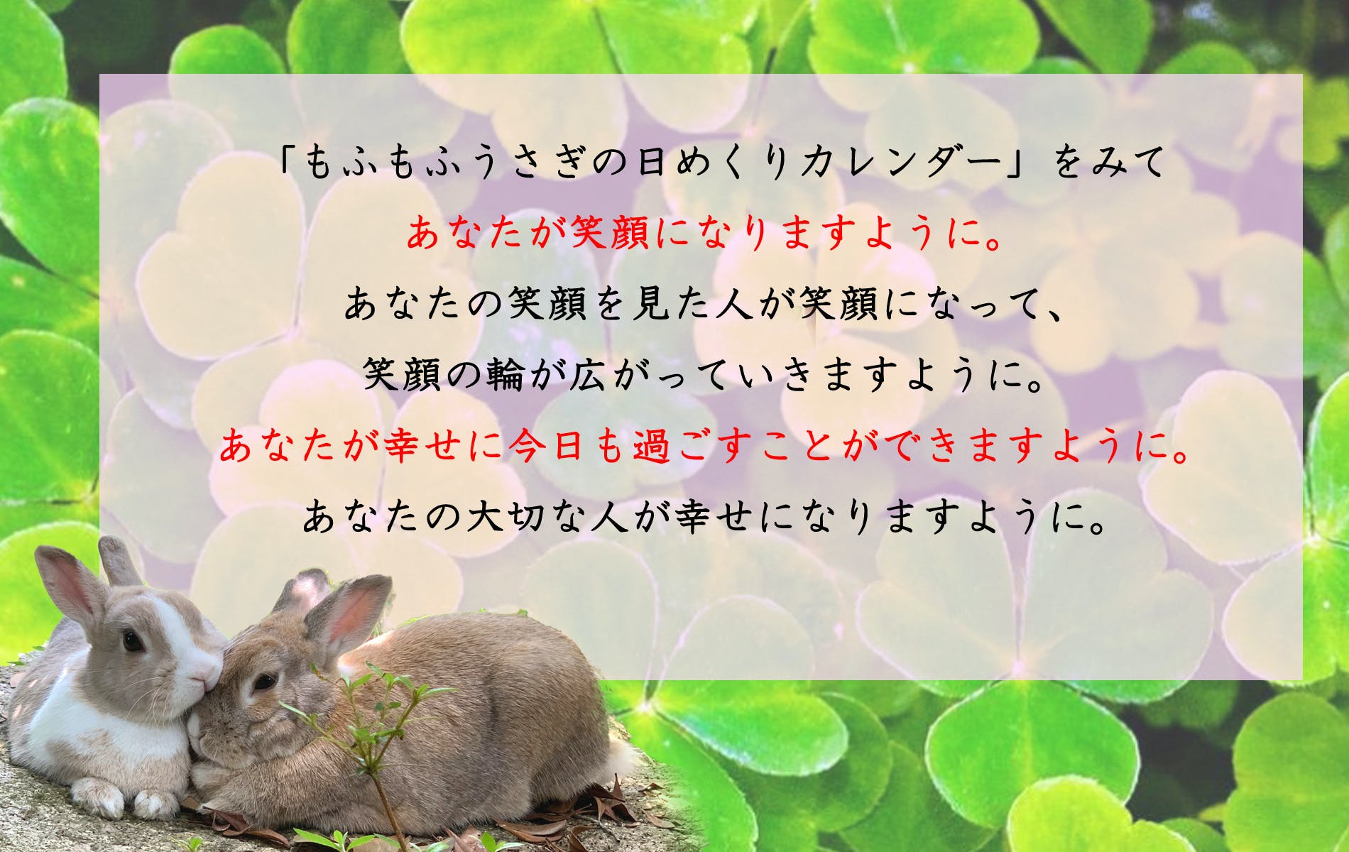 そこで今回の「31羽のもふもふうさぎの日めくりカレンダー」を毎日眺めて、癒されて笑顔になれたら、あなたはもちろんですが、ご家族やお友達やパートナーの方も幸せになります。