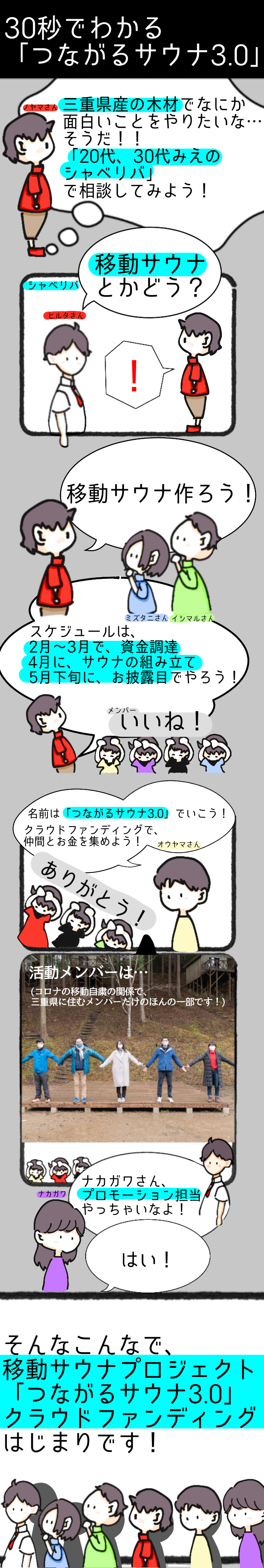 2021/07/17 20:11こんばんは、お久しぶりです!つながるサウナ3.0です。本日はたくさん感謝の気持ちをお伝えしたく、内容が盛りだくさんです。●お披露目会終了のご報告この度、ついにお披露目会を行うことができました〜!嬉しい!!当日は天候にも恵まれながら、聞き心地の良い音楽とヒノキの香りに包まれていました!サウナ作りをしてきて、こうやって形になるのを見ると感慨深いです。いよいよ「つながるサウナ3.0」が完成し、三重県を回る準備が整って参りました。皆様にお会いできる日が楽しみです!ここからはお披露目会の雰囲気を皆様にも、感じていただきたい!というわけで、ほんの少しですがお福分けです。熱々のサウナと、冷たく美しい川で思う存分楽しんで参りました!●ご支援ありがとうございました移動式サウナを作るにあたってたくさんのご支援ありがとうございました。クラウドファンディングの「会社ロゴ掲載」と「お名前掲載」にご支援いただいた方の、ロゴとお名前を「つながるサウナ3.0」に掲載致しましたので、ご報告です!ご支援頂いた方々のロゴはこちらです!↓本当にありがとうございました!ご支援頂いた方のお名前はこちらです!↓本当にありがとうございました!写真で見ると伝わりにくいですが、実際に見ると結構な存在感があります!改めて、遅くなりましたが、皆様のご支援ありがとうございました!!●お披露目会参加者からのレポートお披露目会に参加していた方が感想レポートを書いてくださいました〜!色々試行錯誤しながら続けてきて良かった!!!嬉しい〜!最後は頂いたレポートで気持ちよく締めたいと思います!これからもまだまだ「つながるサウナ3.0」プロジェクトは三重県を旅して参ります!それでは次のイベントでお会いする日を楽しみにしております!!【お披露目会レポート】みえの若者がつながる場から始まる熱い出会い(2021年7月11日) こちらのレビューをお読みいただくにあたって、まず皆さんに知っておいていただきたいことは、私はサウナ初心者ということです。サウナといえば、銭湯のオマケ程度のものだと、ずっと思っていました(サウナ愛好家のみなさま、すみません。)ですから、「サウナのことをよく知らない奴が大自然の中で移動式サウナに入ったらどうなるのか?」という視点で、レビューを書いています。 「つながるサウナ3.0」のプロジェクトには、アイデアが生まれた時から参加していたので、ようやく完成したサウナに命が吹き込まれるこの日は、少し緊張気味に、お披露目会の会場である名張市の赤目四十八滝キャンプ場へ向かいました。キャンプ場に到着すると、そこには、木々をバックに煙突からモクモクと煙を吐くサウナが…!!デザインはすっきりとシンプルで、天然のヒノキならではの色彩と穏やかな香りは、そこにいるだけで安心感が心を満たします。 いよいよ、サウナに入ってみます。熱い!十分熱いです!これは…サウナや!!温度は75度、湿度も70%を超えていました。見事、ヒノキサウナの完成!! サウナでじっくりと汗をかいた後は、キャンプ場のすぐ下を流れる川で体を冷やします。いや気持ちよすぎるやろ!!サウナで熱くなった体を冷水でクールダウンすることで体の内部は熱いままですが、体表には心地よく冷たい層ができます。このことをサウナ用語で「羽衣をまとう」というらしいです。オシャレか。 天然の水風呂の後は外気浴。木々に囲まれたキャンプ場で川のせせらぎを聴きながら、心地よい風に吹かれていると、スーっと心が落ち着いて、あちこちに散っていた自分の意識が、自然と自分の内面に向けられているような感覚になっていきます。この、サウナ→水風呂→外気浴のサイクルで心身をリラックスさせることを、サウナ用語で「ととのう」というそうです。私も、自分の体が磨かれて、思考が整理され、精神がフラットな状態になる、まさに「ととのう」時間を体感しました。 また、「つながるサウナ」は移動式なのでキャンプ場に設営することで、大自然のエネルギーを借りて全身が「ととのう」点が格別です。やはり、水道水ではなく天然の川の水、エアコンではなく森から吹いてくる風で体を包むことができるところが、移動式サウナの最大の魅力といえるでしょう。 ところで、銭湯のサウナといえば、据え付けられているテレビを見ながら過ごすイメージが、私は強いです。しかし、当たり前ですが移動式サウナにはテレビがありません。自然と、そこに居合わせた人との会話が始まります。思えば、わずか2メートル四方の箱の中で話す機会は、そうそうありません。外界の刺激を排除した親密な空間を活かして、「今度ゆっくりお話ししましょう!」など言っておいて、なかなかお話しできていなかった人とも、ここぞとばかりにじっくりと話すことができました。 実は今まで、みえのシャベリバのメンバーとは、オンラインで話したことはあっても、リアルで一緒に過ごした時間は少ない、コロナ禍ならでは