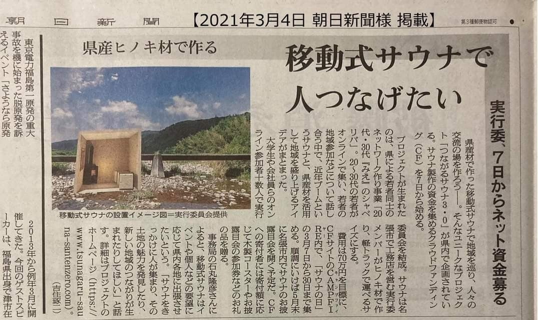 県産ヒノキ材で作る 移動式サウナで人つなげたい 2021年3月4日 朝日新聞