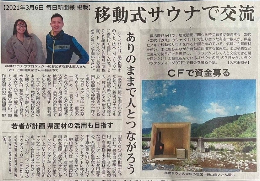 移動式サウナで交流を 三重の若者ら資金募る 県産ヒノキ活用 2021年3月4日 毎日新聞・毎日新聞デジタル