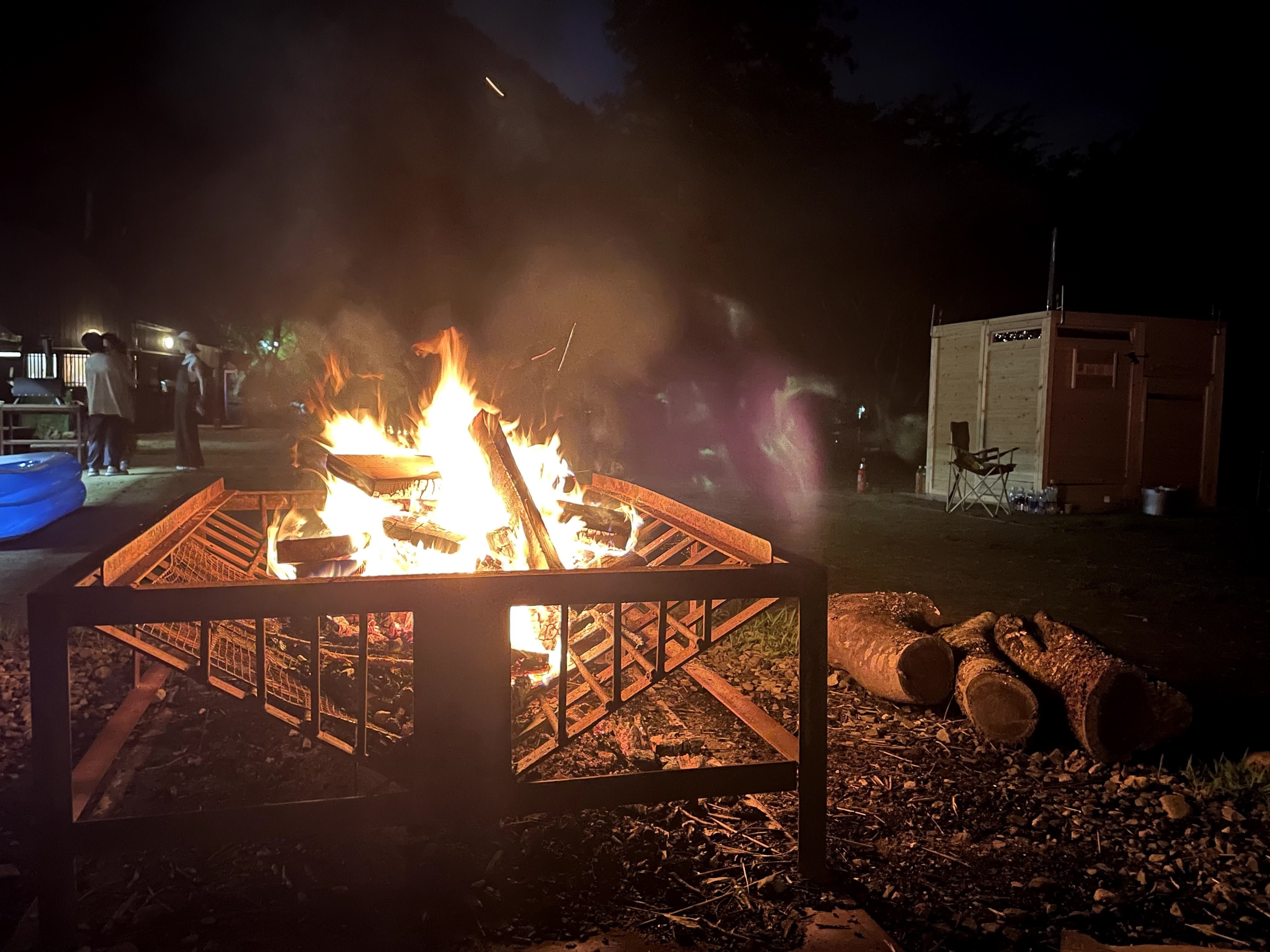 「つながるサウナ3.0」のプロジェクトには、アイデアが生まれた時から参加していたので、ようやく完成したサウナに命が吹き込まれるこの日は、少し緊張気味に、お披露目会の会場である名張市の赤目四十八滝キャンプ場へ向かいました。キャンプ場に到着すると、そこには、木々をバックに煙突からモクモクと煙を吐くサウナが…!!デザインはすっきりとシンプルで、天然のヒノキならではの色彩と穏やかな香りは、そこにいるだけで安心感が心を満たします。