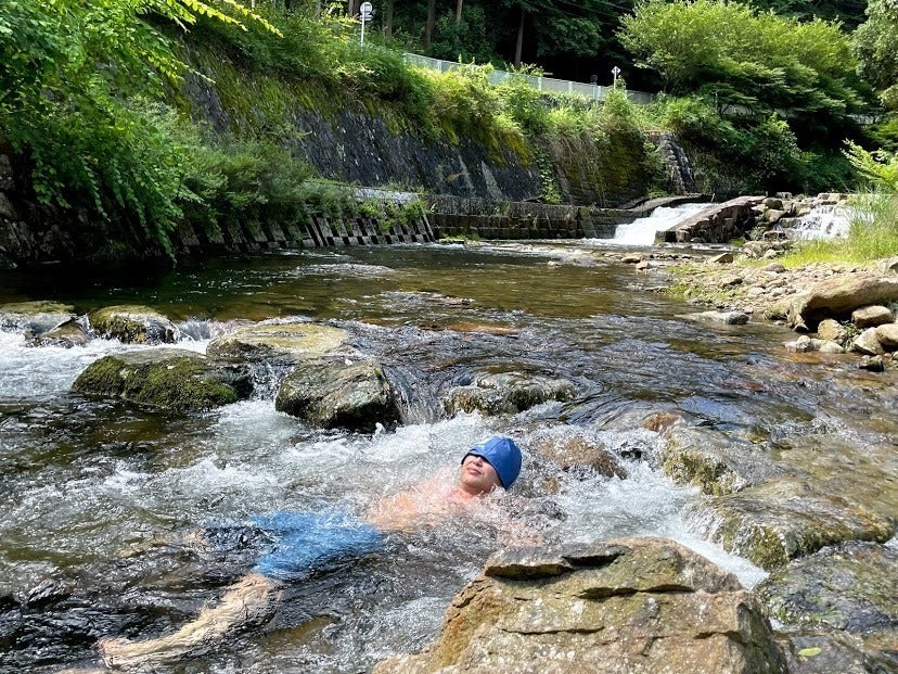 サウナでじっくりと汗をかいた後は、キャンプ場のすぐ下を流れる川で体を冷やします。いや気持ちよすぎるやろ!!サウナで熱くなった体を冷水でクールダウンすることで体の内部は熱いままですが、体表には心地よく冷たい層ができます。このことをサウナ用語で「羽衣をまとう」というらしいです。オシャレか。