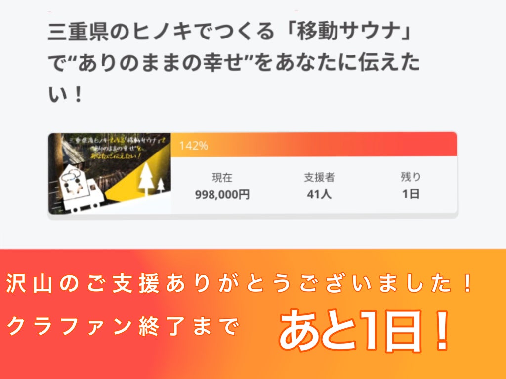 こんばんは、クラファン終了いたしました!46名の方から1,126,500円という、たくさんのご支援をいただき、本当にありがとうございました!クラファンを初めて3日で100%を越えるなど、順調なスタートを迎えることができ、メンバーと計画していたclubhouseも続けることができました。4月初めには、移動サウナの組み立ても計画しています。5月末にはお披露目会を、その先も少しずつ、予定が埋まってきています。まだまだこの活動は広がって参ります!今後の活動については、この活動報告や、サイト等で発信していくことになるかと思います。精一杯、これからも頑張りながら、全力で楽しみながら、このプロジェクトを進めて参りますので、見守っていただければ幸いです。改めて46名の皆さま、ご支援ありがとうございました!「入金はできやんかったけど、周りの人に話したよ」「協力したよ」という皆さまもありがとうございました!ぜひこの「つながるサウナ3.0」がご支援していただいた、あなたの街にいつか届きますように!