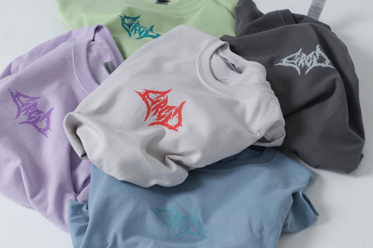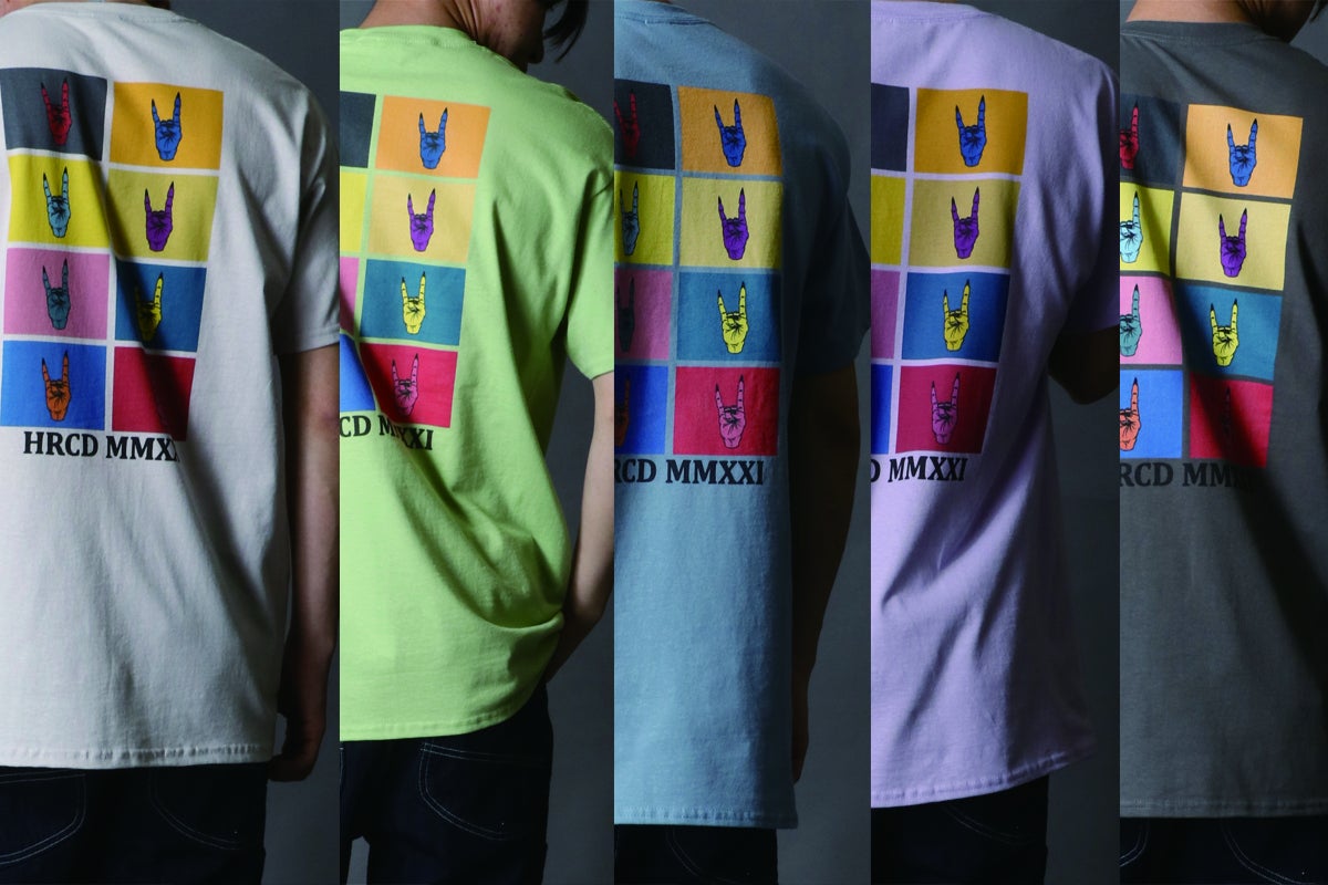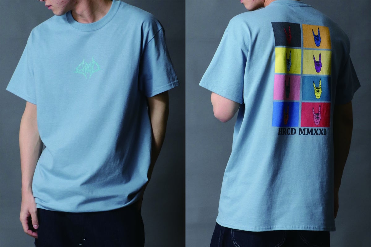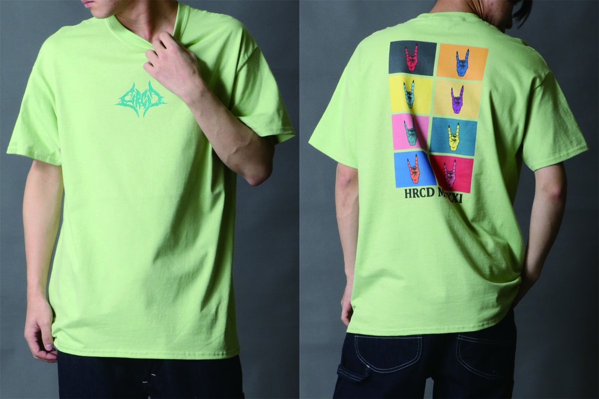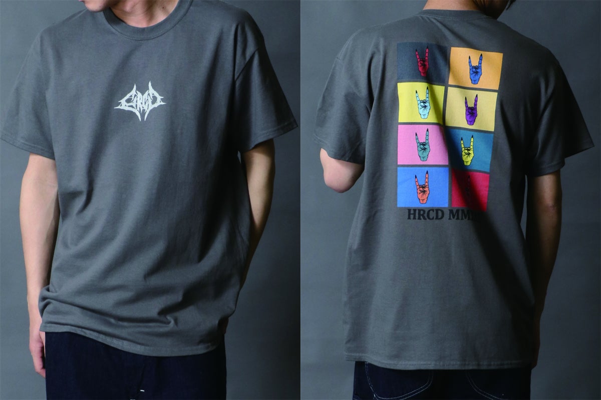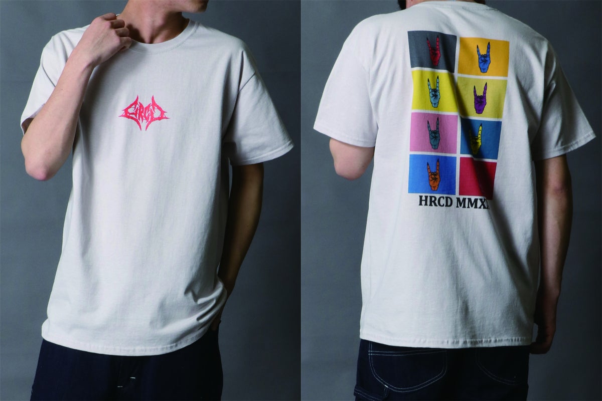 Tシャツのフロント(前面)にはブルータルなバンドロゴ風デザインのHRCDオリジナルロゴをプリント。ボディ(Tシャツ本体)の色に合わせて、カラーを変更しています。