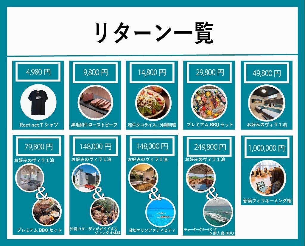 リターンでは、私たちの原点である、あたらしいリゾート旅『Reefing』を体感していただける内容を用意しています。私たちが自信をもってお勧めしている「居の体験」「食の体験」「遊の体験」を通して、真の沖縄を存分に味わうことで、Reefingが生み出す真の価値を実感していただけたらと思います。