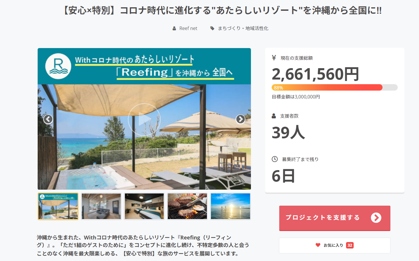 今回ご支援いただきました資金につきましては、2022年を目途に、全国展開(兵庫、福岡、千葉、その他)を予定しております、あたらしいリゾート『Reefing』を広めるための予約システム・プラットフォーム開発費やコンテンツ開発にかかる運営費に充てさせていただきます。