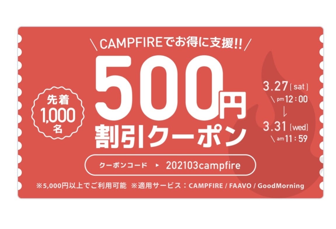 プロジェクト支援画面のクーポンコード欄にクーポンコード「202103campfire」をご入力下さい
