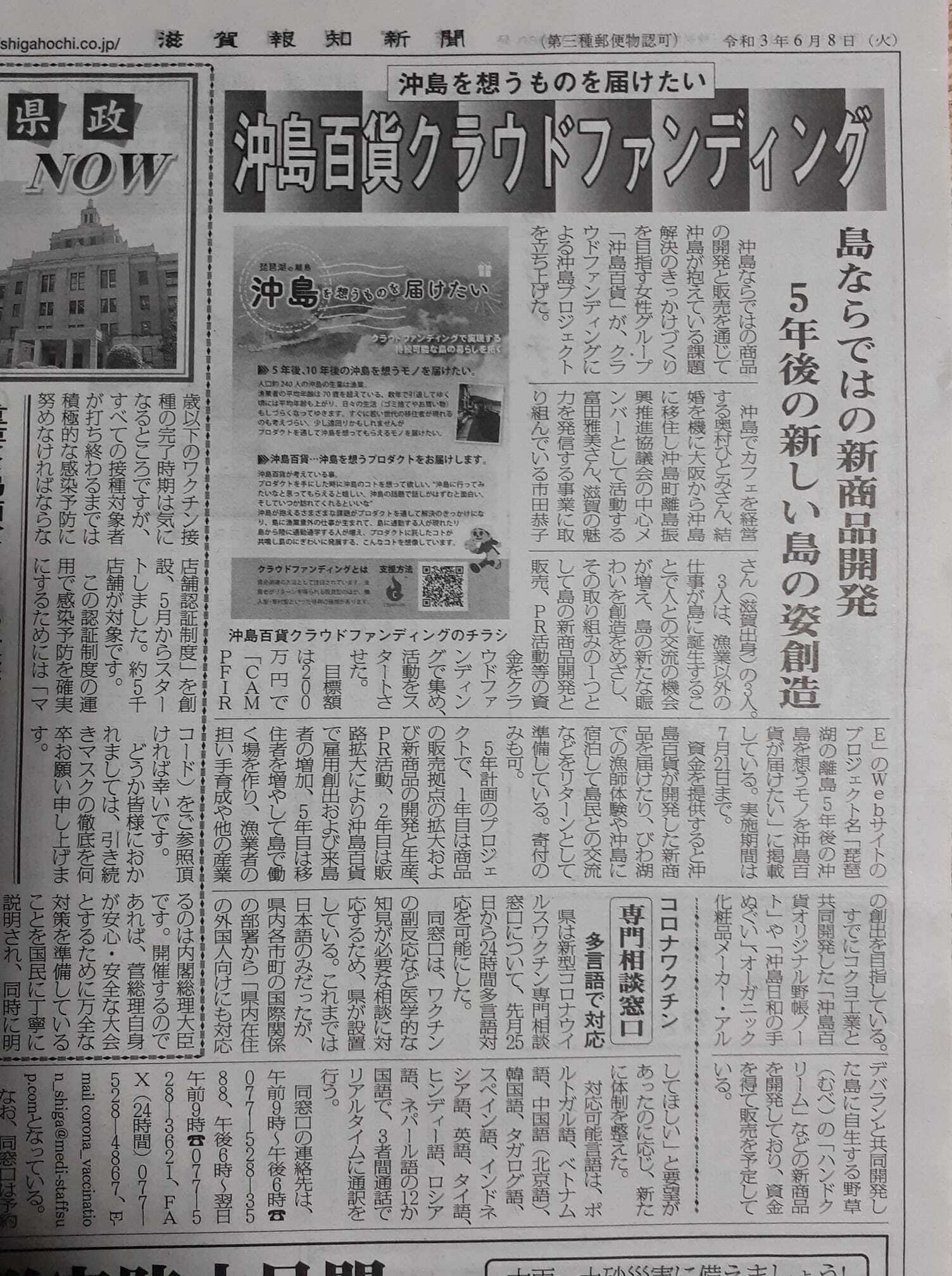 この先も沖島に住み続けられる様に、コロナ禍でお客様に来ていただけない今だからこそ出来る形を考え、商品をお届けする事で沖島を想っていただき、来島や移住等のきっかけになればと思い今出来る事をコツコツ取り組みます。