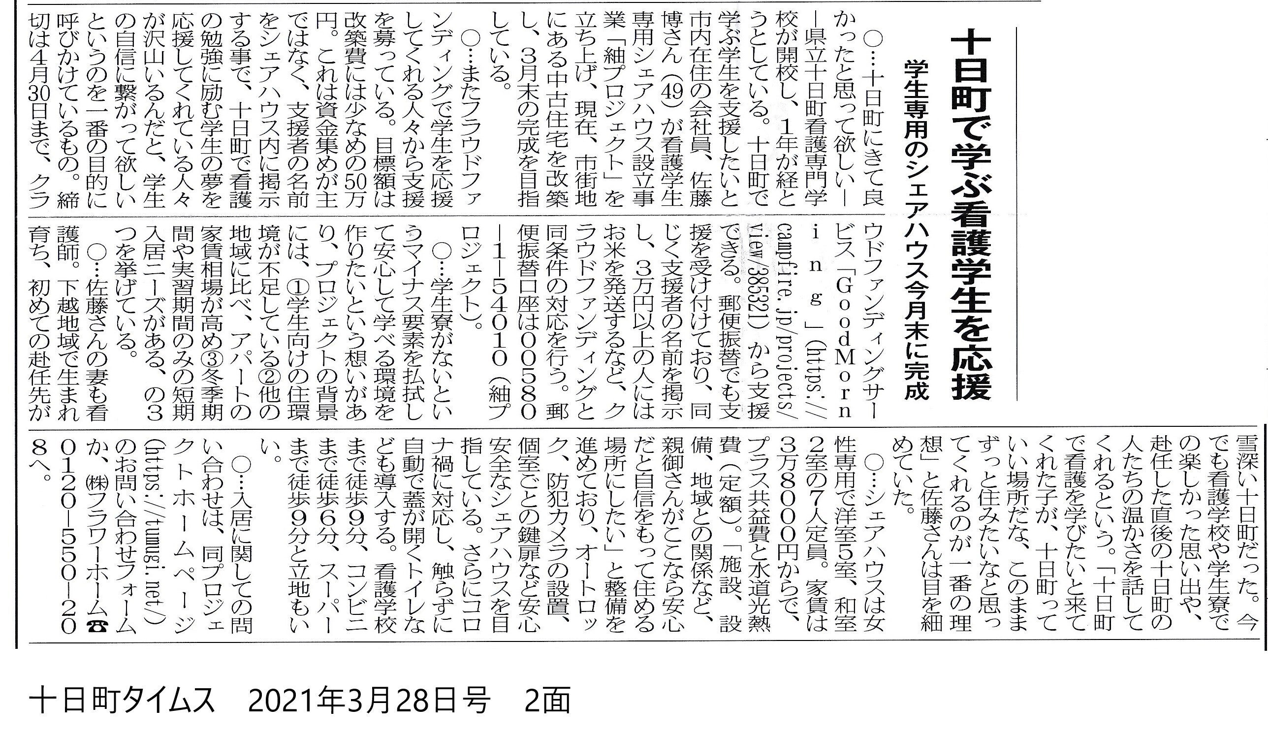 地元新聞「十日町タイムス」にシェアハウスの記事が掲載されました。