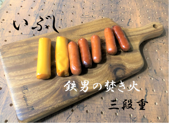 鉄男の三段重にご支援、ご協力をいただいている皆様大変お世話になりっております。三段重の開発を進めながら、薫製をするのにハマっております。今日はソーセージと、さけるチーズ、スモークウッドさくらを用意しました。さけるチーズは初挑戦です^^あわてないよう着火の前に食材を網にのせてセットしておきます↓火八にスモークウッドをセットします(これホームセンタ―で売っており手軽で便利です)↓バーナーなどで着火してください、結構燃やしても大丈夫です↓するとモクモクと煙が上がるようになります。火は自然とおさまります↓火八の上に食材の入った炉(虹燃)をセットします↓その上から鉄板(小鉄)で蓋をして煙を閉じ込めます↓このままの状態で約90分待ちます↓火が消えて蓋を開けるとスモークされてきれいに色付いています^^↓薫製は意外と簡単にできます♪レシピ開発するのも楽しいです!さけるチーズは外側が硬くなりすぎてしまいました(;_;また新しい食材にチャレンジしてみます!三段重の開発は現在も改良を重ねて完成度を高めております。お届けまで楽しみにお待ちください^^