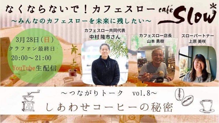 「なくならないで!カフェスロー みんなのカフェスローを未来に残したい」2月19日 12時にスタートしたクラウドファンディングは、3月28日 23時59分、無事に終了しました。皆さんからのご支援や応援メッセージが大きな力となって、782名の方から、目標額の160%を超える支援が集まりました!ありがとうの言葉では表しきれないくらい胸が一杯です。本当に本当に、ありがとうございました!!クラウドファンディングは終了しましたが、ここからまたカフェスローの歩みが始まります。応援してくださった皆さんとカフェスローが、これからもつながり続けますように。これから1つ1つ心を込めて、リターン(お礼品)の発送をします。気長にお待ち頂けると幸いです。スローパートナー一同・・・・・〜カフェスローからのメッセージ〜支援くださいました、みなさまへ。おかげさまで「782人、8,033,680円」という結果で、本当にたくさんの方からのご支援・暖かいお気持ちをいただくことができました。改めましてみなさまに支えられて、築き上げられてきた場所なのだと実感しております。ありがとうございます。5月22日の20周年を控え、これからも「みんなのカフェスロー」ということを胸に抱き、日々お店作り・場作りに努めて参りたいと思います。どうぞこれからも、一緒に、カフェスローを創っていただけたら、また応援いただけたら嬉しいです。簡単ではございますが、まずはお礼のご挨拶に代えさせていただきます。カフェスロー・・・・・8回にわたり、つながりトークをお送りしました。ご視聴、ご出演いただいたみなさま、ありがとうございました!