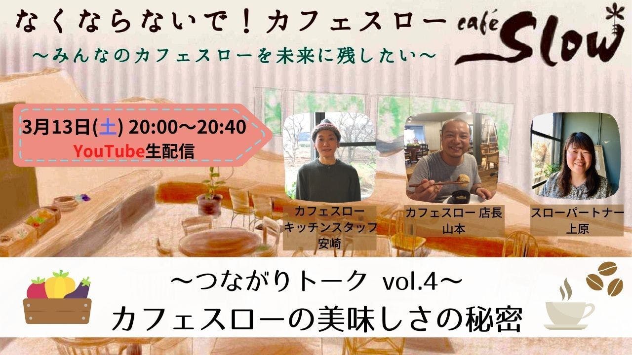 カフェスローがこだわる「食」について、キッチンスタッフ安崎さん、店長山本さん、スローパートナー上原の3人が深掘りしてお話します。